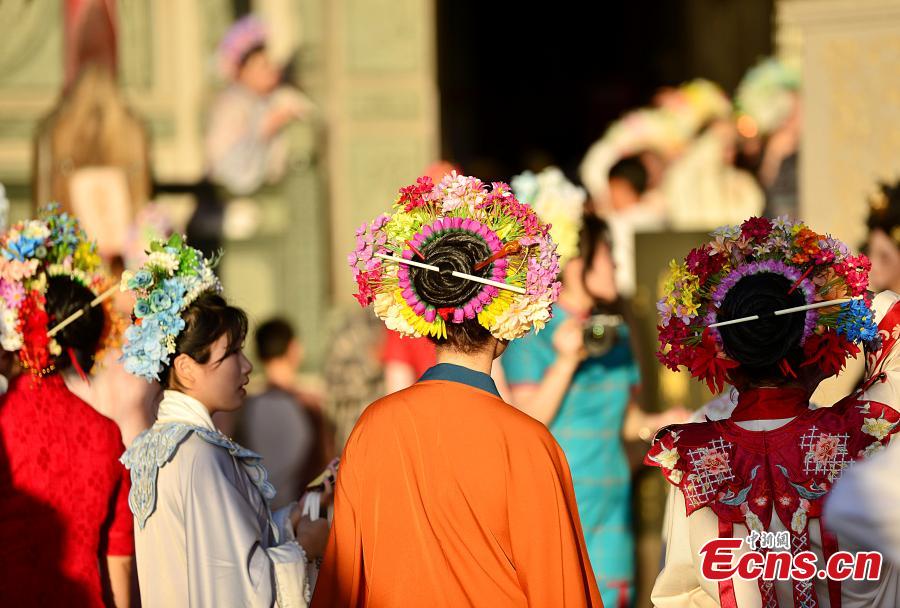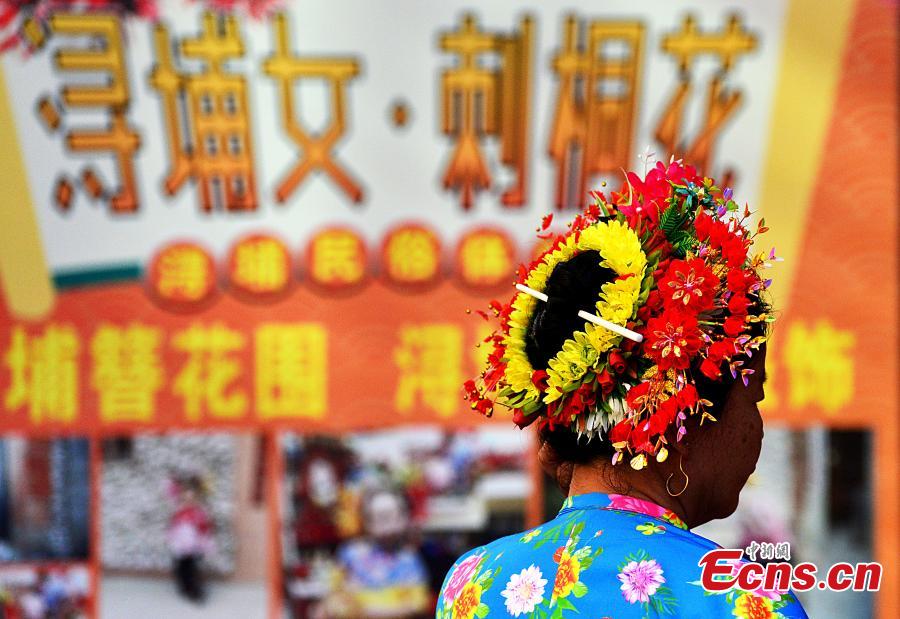 The floral headdress,a traditional symbol of Xunpu women, is called Zanhuawei in Quanzhou, a port city known as one of the starting points of the ancient maritime silk road. The flowery headwear is made of fresh flowers and hairpins and was included in the second batch of national intangible cultural heritage in 2008.