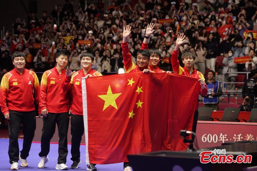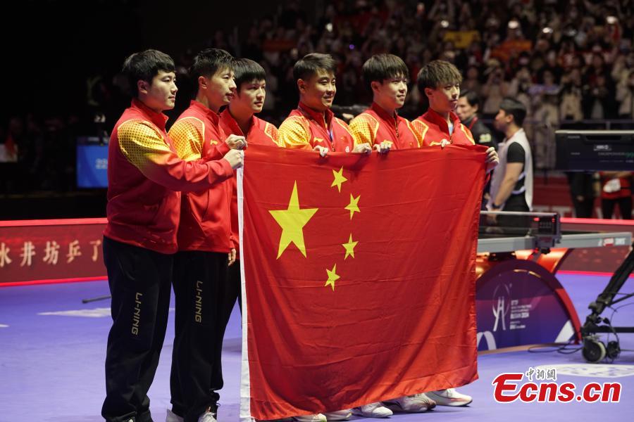 Team China celebrates during the awarding ceremony for the men's team at the ITTF World Team Table Tennis Championships Finals Busan 2024 in Busan, S Korea, Feb. 25, 2024. (Photo: China News Service/Liu Xu)