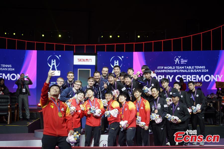 Gold medalists China takes a group photo with silver medalists France and bronze medalists South Korea and Chinese Taipei during the awarding ceremony for the men's team at the ITTF World Team Table Tennis Championships Finals Busan 2024 in Busan, S Korea, Feb. 25, 2024. (Photo: China News Service/Liu Xu)