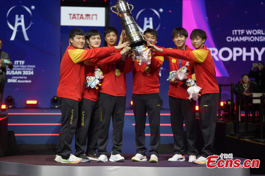 Team China celebrates with the trophy during the awarding ceremony for the men's team at the ITTF World Team Table Tennis Championships Finals Busan 2024 in Busan, S Korea, Feb. 25, 2024. (Photo: China News Service/Liu Xu)