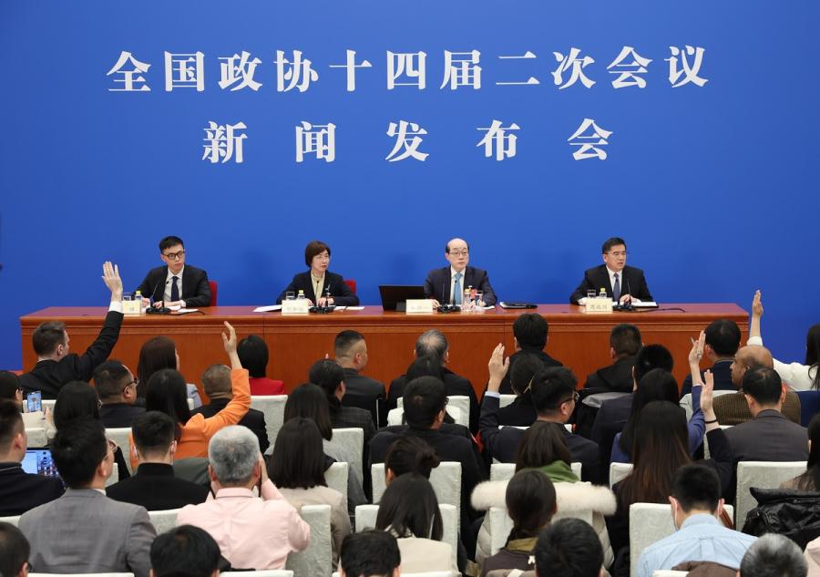 Journalists raise hands to ask questions at a press conference of the second session of the 14th National Committee of the Chinese People's Political Consultative Conference at the Great Hall of the People in Beijing, March 3, 2024. (Photo by Zou Hong/chinadaily.com.cn)