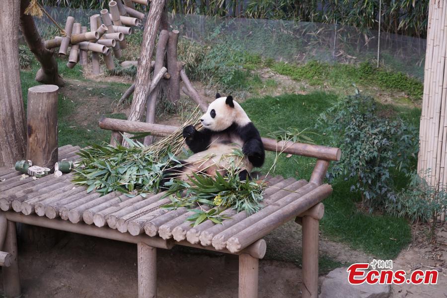 Fu Bao, the first giant panda born in South Korea in 2020, eats bamboo at Everland theme park in Yongin, South Korea, March 3, 2024. (Photo: China News Service/Wang Gang)