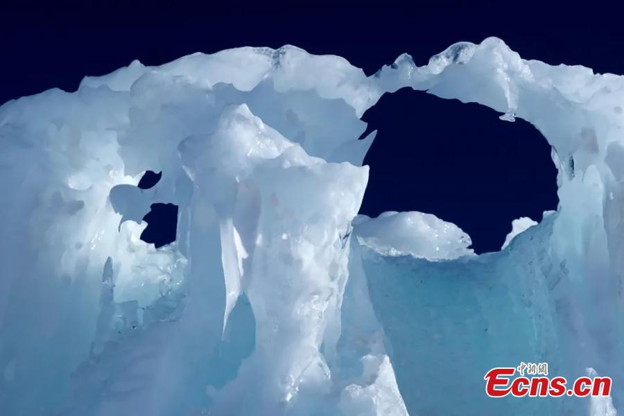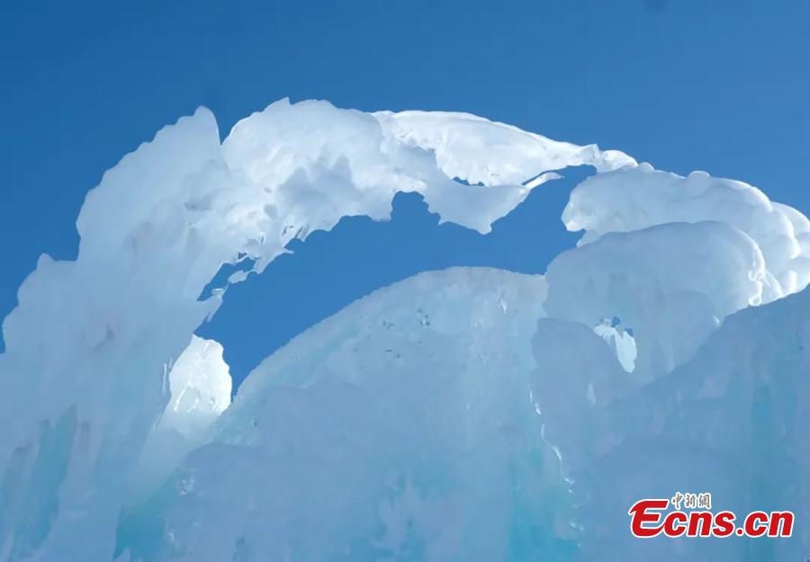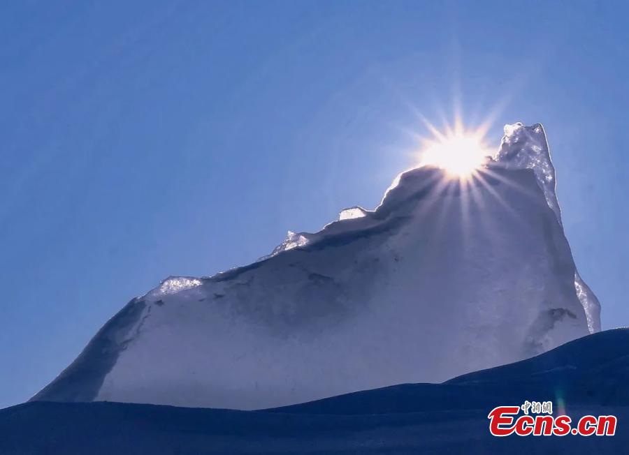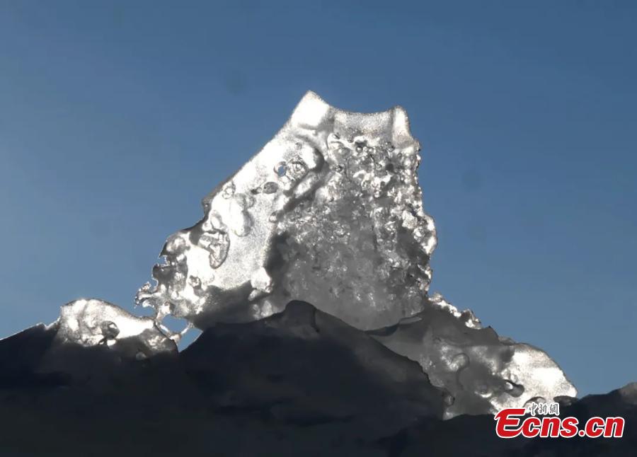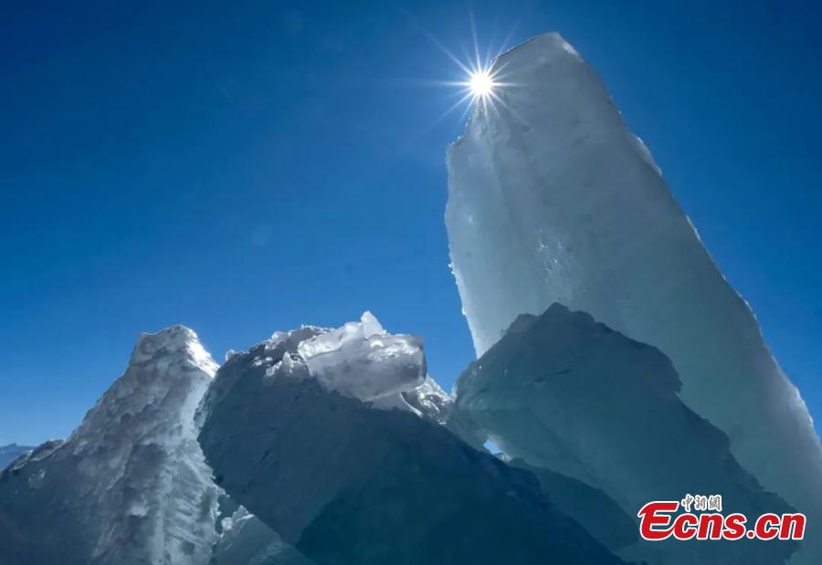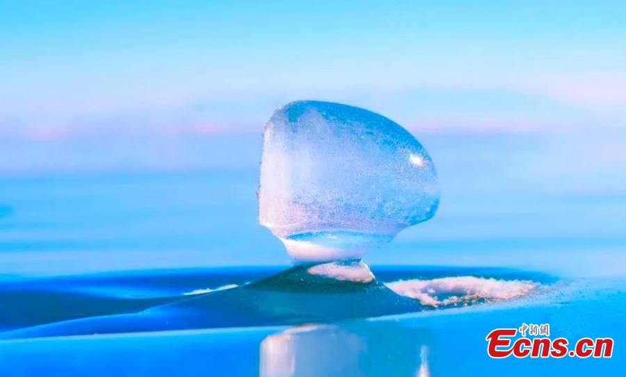 A clear ice is raised above the lake surface under the blue sky on Sayram Lake, the largest alpine lake in Bortala Mongolian Autonomous Prefecture, northwest China's Xinjiang Uyghur Autonomous Region. (Photo: China News Service/Dai Yuanjian)