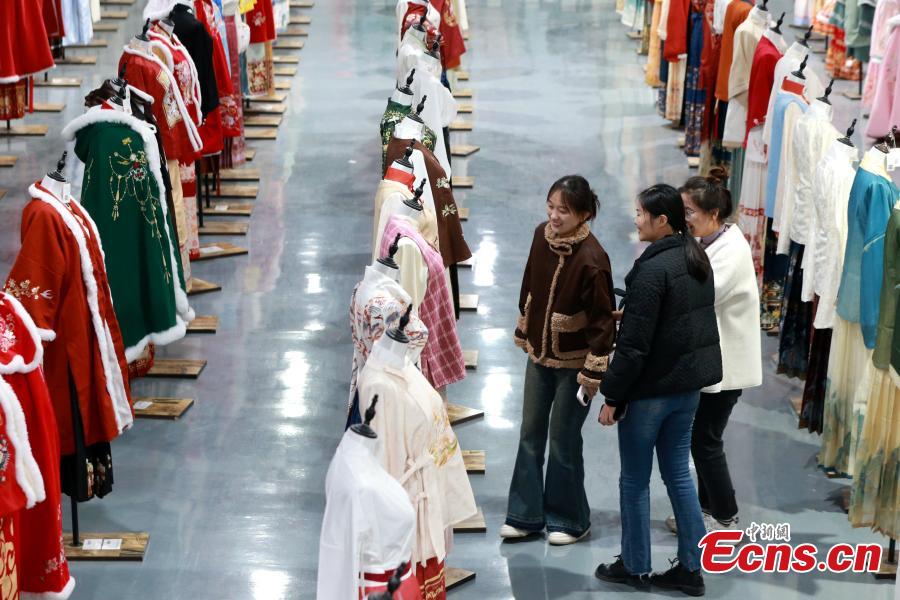 Customers select horse-face skirts at a garment factory in Caoxian County, east China's Shandong Province, March 4, 2024. (Photo: China News Service/Liang Ben)