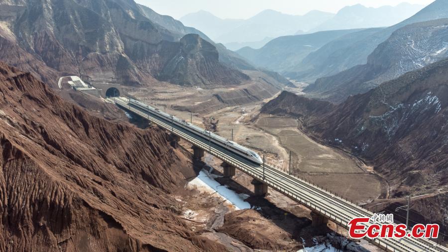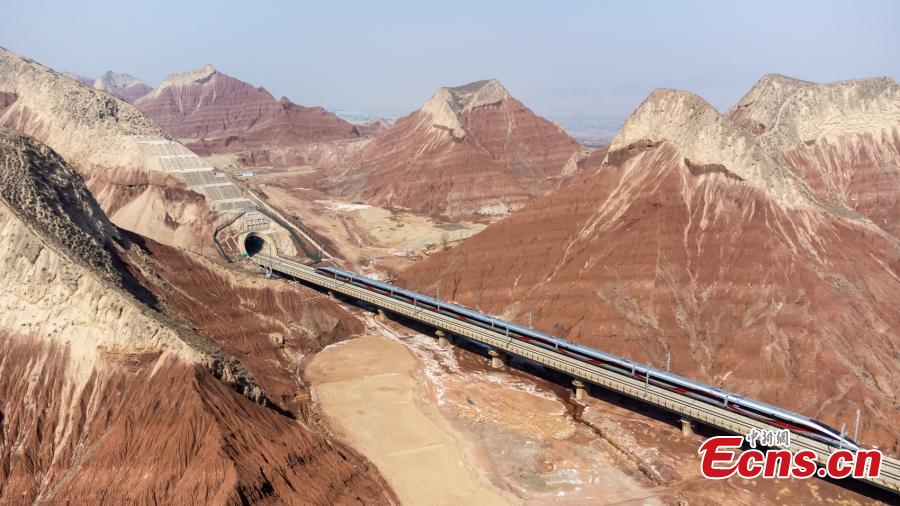 A high-speed train runs through the northern foot of the Qilian Mountains with Danxi landform in Lanzhou, northwest China's Gansu Province, March 3, 2024. (Photo/VCG)