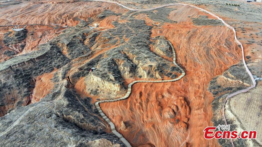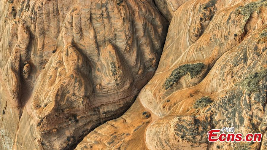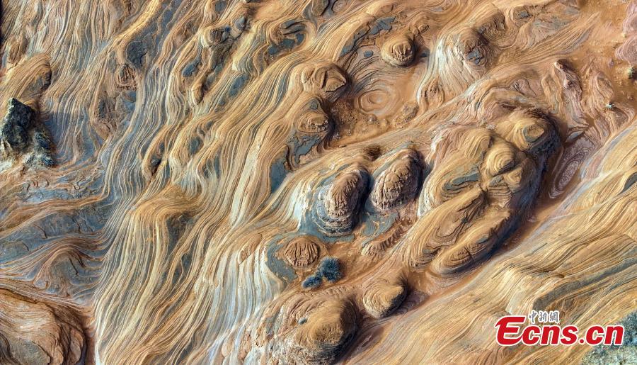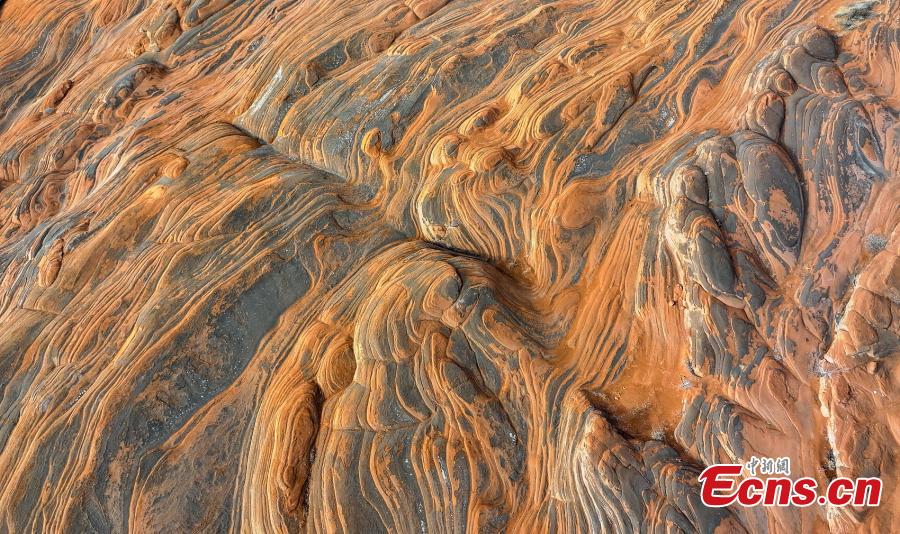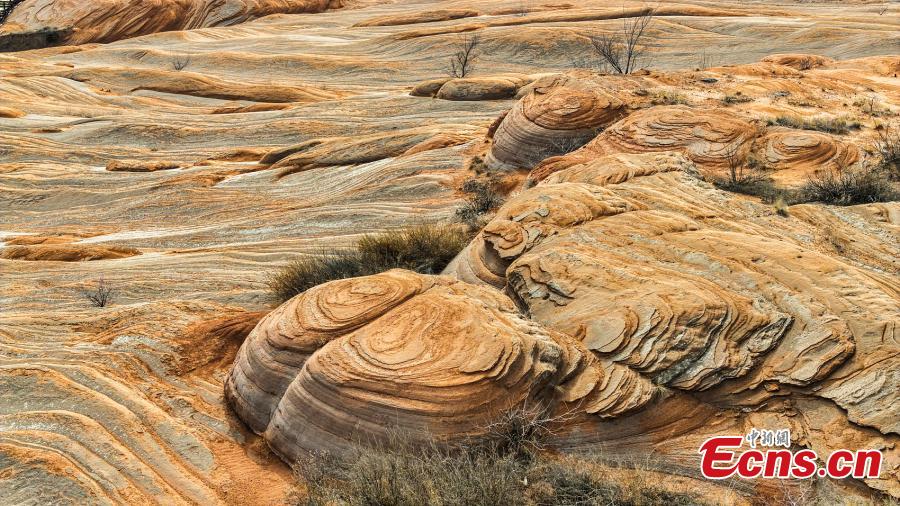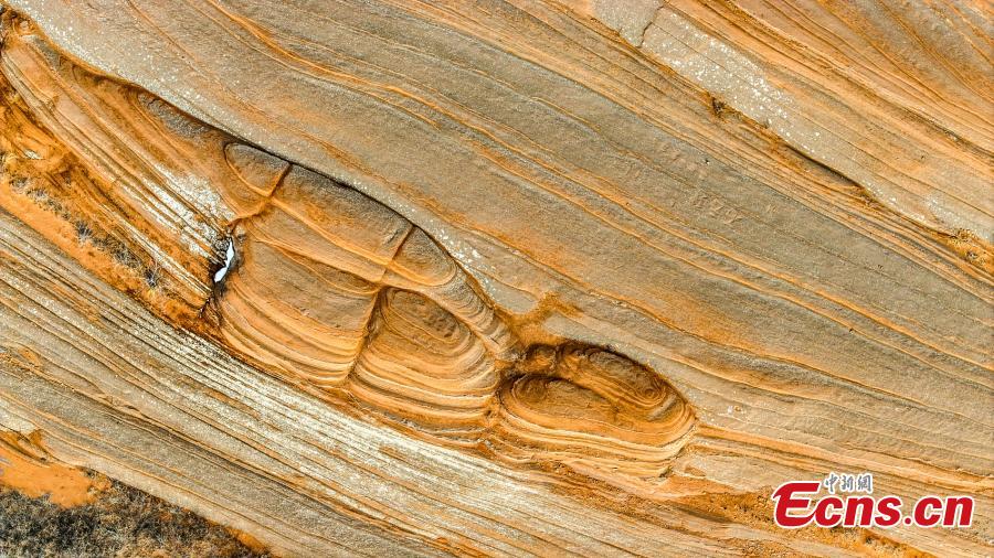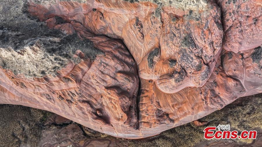 The close-up of stratified rocks of Danxia landform, a landscape characterized by reddish sandstone features, in Longzhou Town of Jingbian County, northwest China's Shaanxi Province, March 5, 2024. (Photo/VCG)