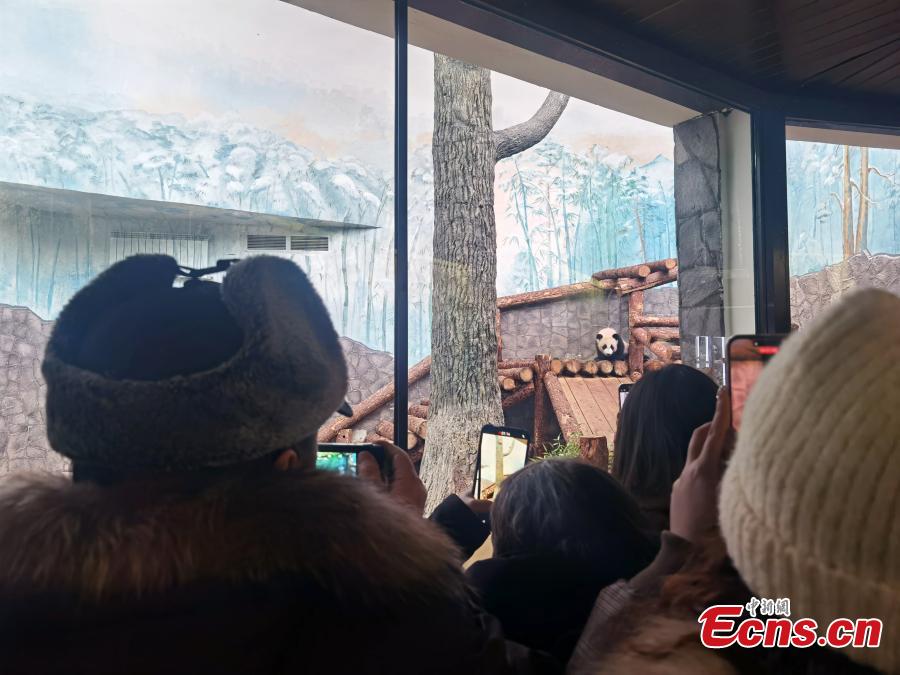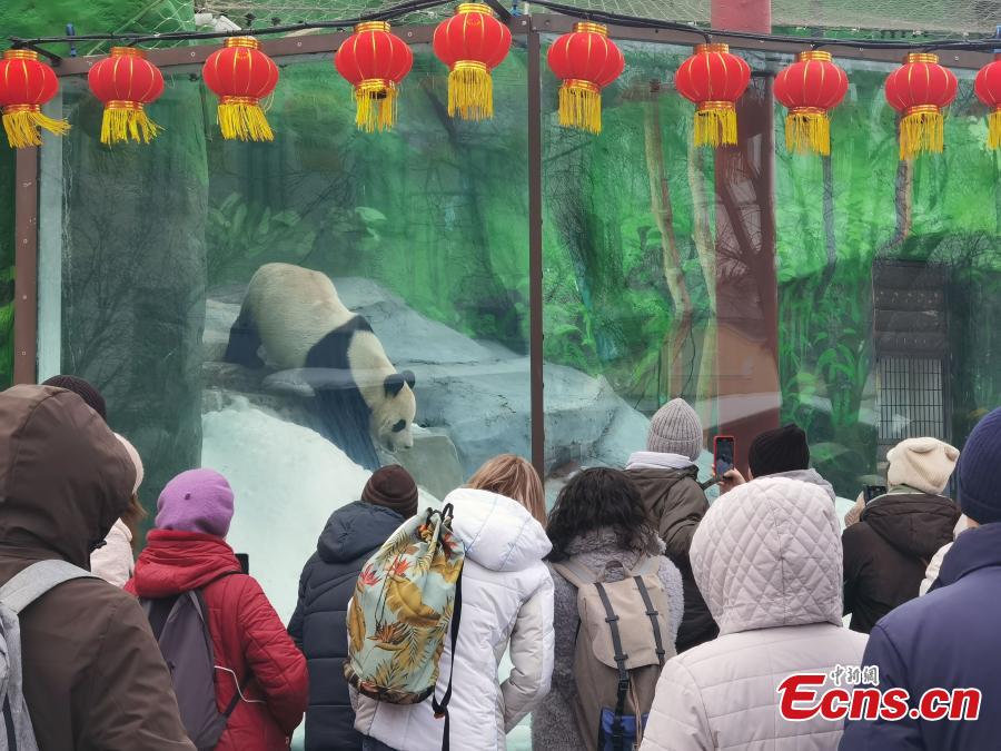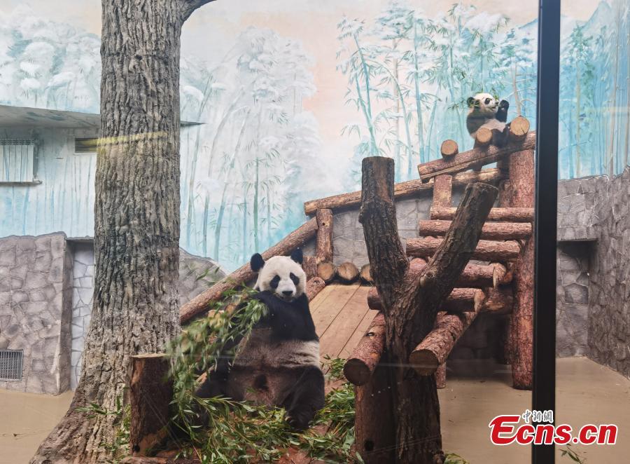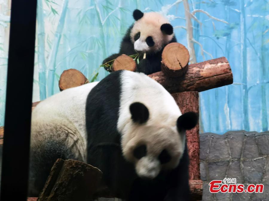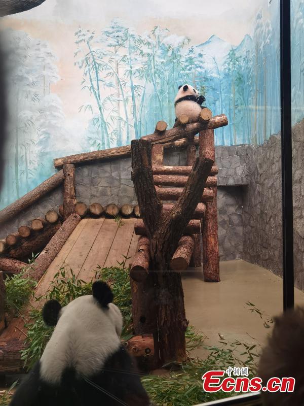 Katyusha, the first panda cub born in Russia, plays with her mother Ding Ding at the Moscow Zoo in Russia, March 8, 2024. (Photo: China News Service/Liu Boyan)