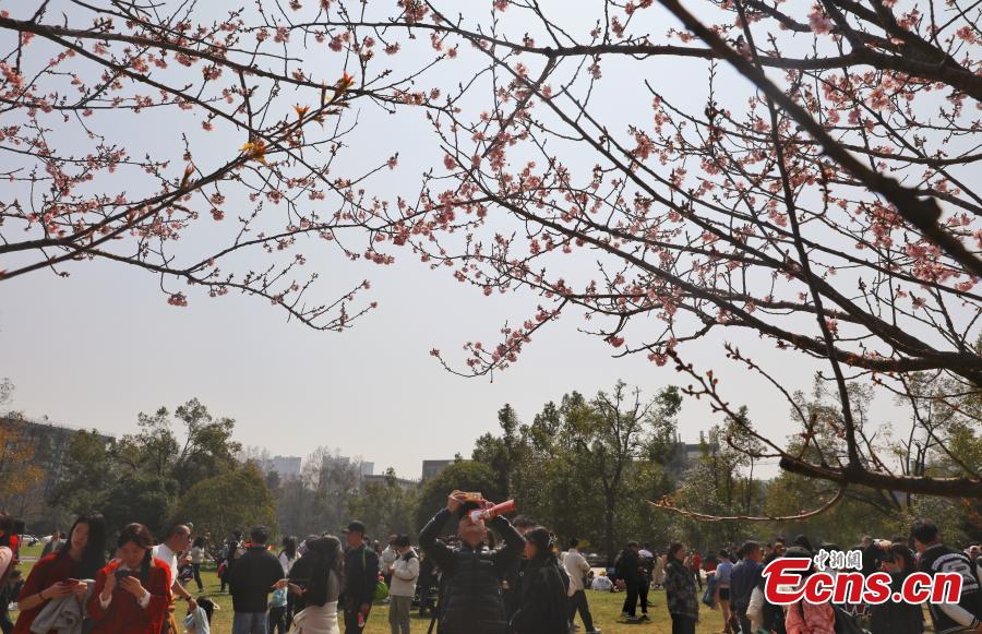 Early cherry blossoms bloom at Wuhan University in central China's Hubei province, March 10, 2024, attracting teachers, students and visitors to take photos.(Photo: China News Service/Zhang Chang)