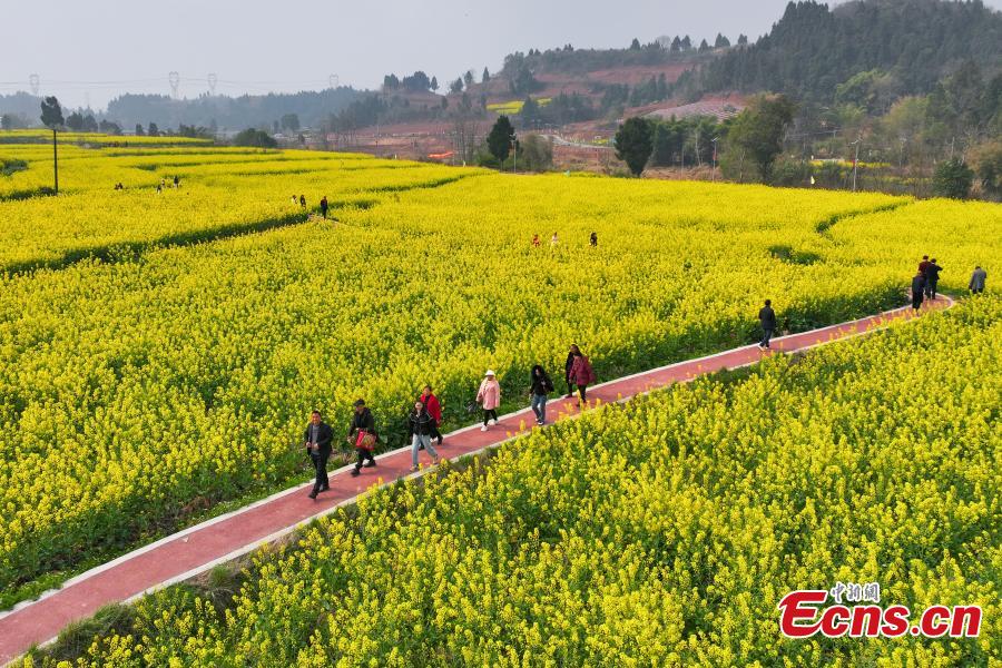 Tourists visit Panlong Village in Renshou County, Southwest China's Sichuan Province, March 9, 2024 as cole flowers bloom in spring. (Photo: China News Service/Liu Zhongjun)