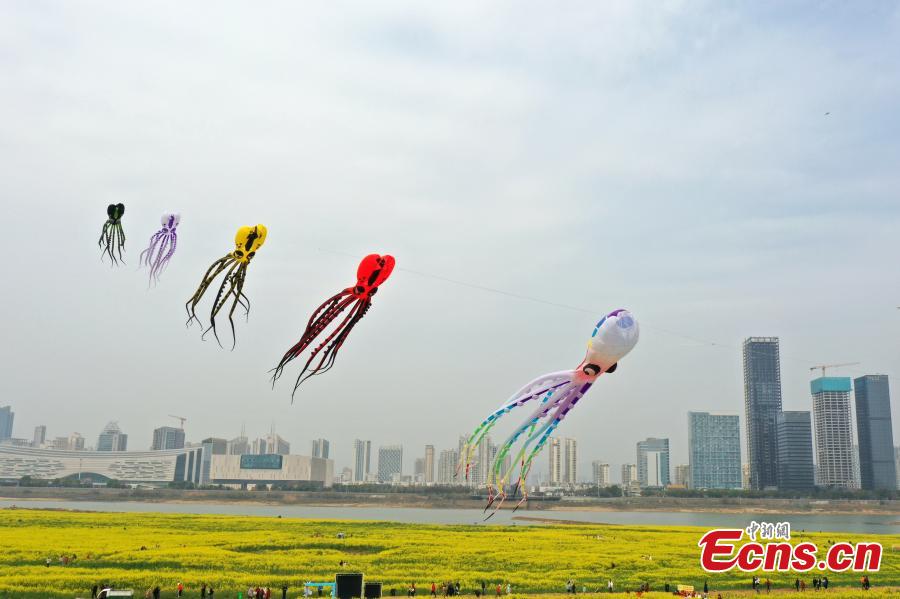 Kites fly over cole flower fields in Donghu District of Nanchang City, Jiangxi Province, March 9, 2024. (Photo: China News Service/Liu Zhankun)