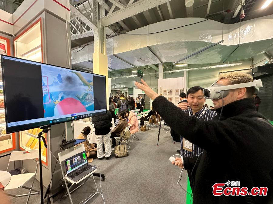 A visitor experiences VR reading at a booth during the London Book Fair, UK, March 12, 2024. (Photo: China News Service/Ouyang Kaiyu)