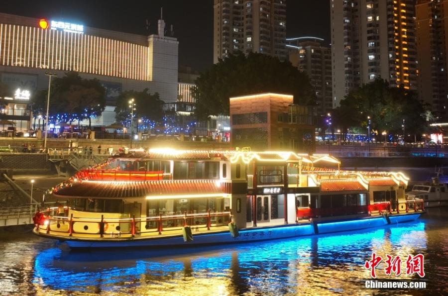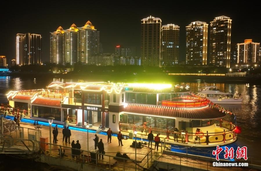 A new energy cruise ship named Min Jiang Hui Ke Ting (Minjiang Meeting Room) is unveiled on Minjiang River in Fuzhou, east China's Fujian Province, March 12, 2024. (Photo: China News Service/Zhu Weixiang)