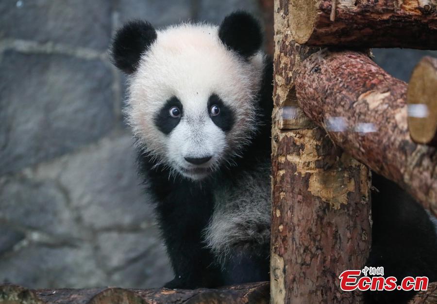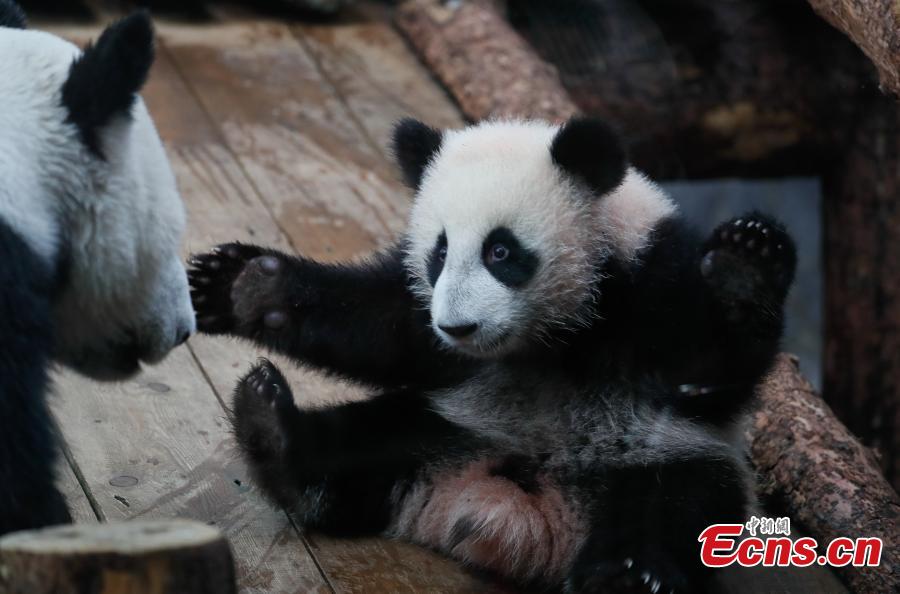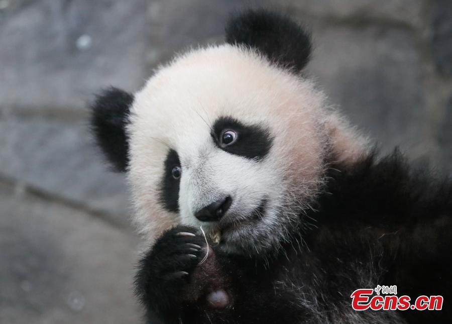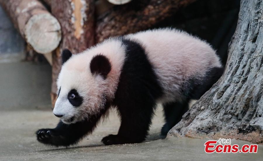 Katyusha, the first panda cub born in Russia, plays at the Moscow Zoo in Russia, March 12, 2024. (Photo/Cphoto)