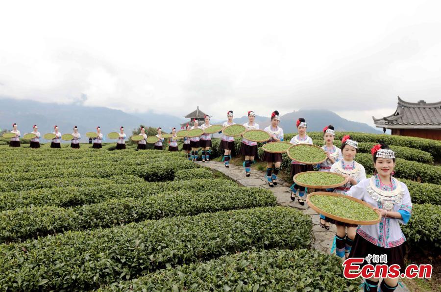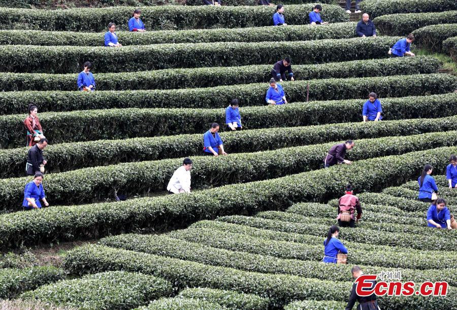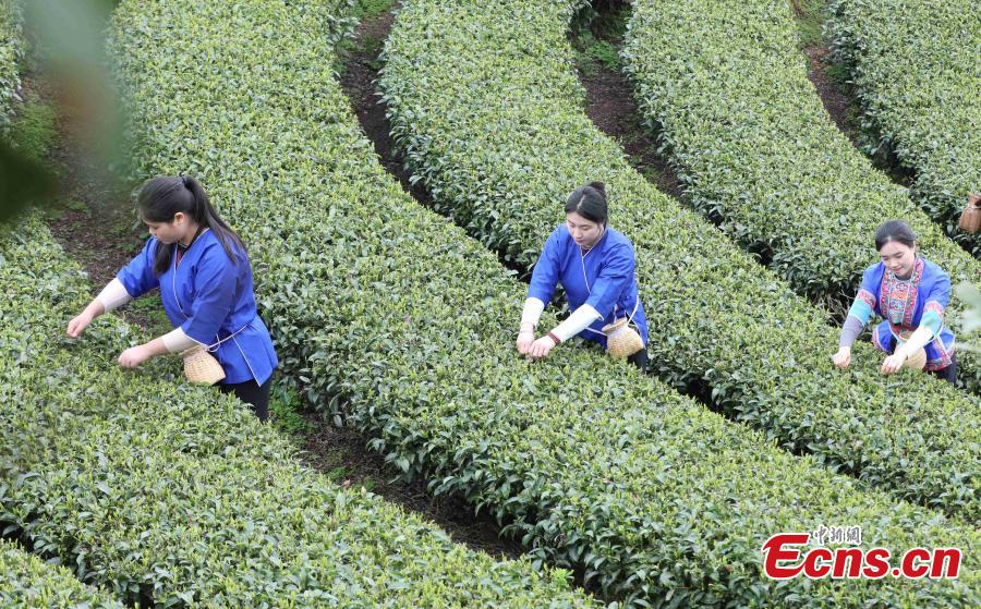 Villagers harvest tea leaves in a tea garden in Sanjiang Dong Autonomous County, South China's Guangxi Zhuang Autonomous Region, March 14, 2024. (Photo: China News Service/Wu Lianxun)