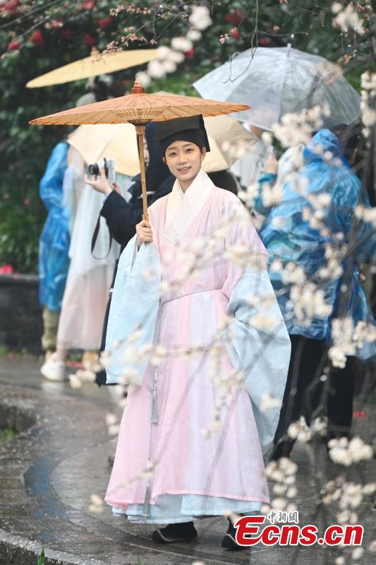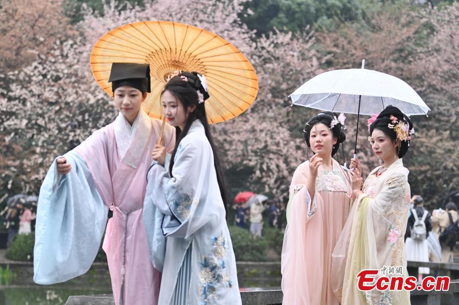 Visitors in Hanfu (a traditional Chinese costume) pose for a photo amid cherry blossoms at the Wangyue park in Changsha, central China's Hunan Province, March 17, 2024. (Photo: China News Service/Yang Huafeng)