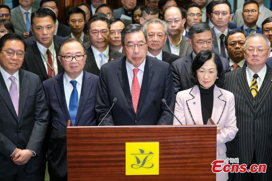 Andrew Leung Kwan-yuen, and the council members of the Legislative Council (LegCo) of the Hong Kong Special Administrative Region (HKSAR) meet the press after LegCo passed the safeguarding national security bill in Hong Kong, March 19, 2024. (Photo: China News Service/Chen Yongnuo)