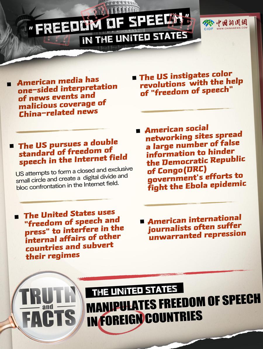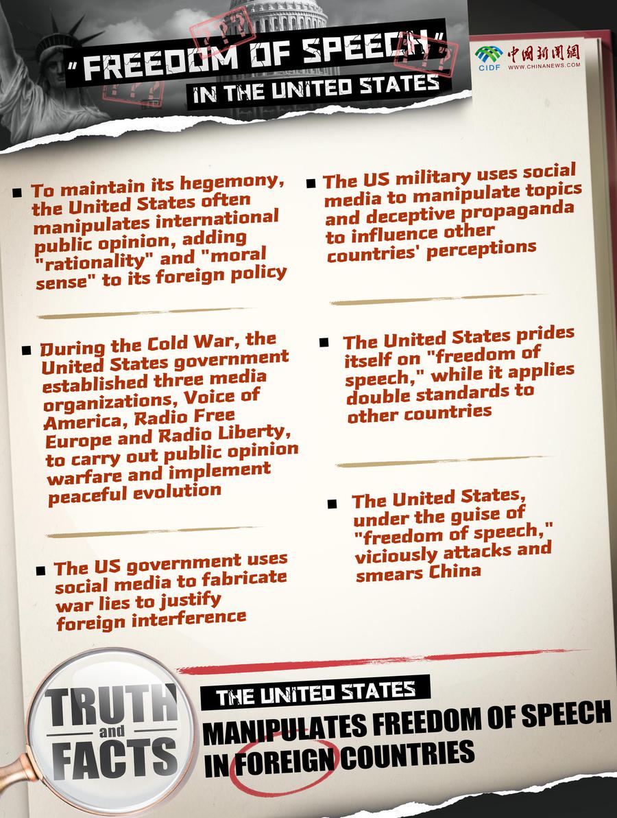 China's Ministry of Foreign Affairs released a report last Thursday that presents the truth and facts of "freedom of speech" in the United States. The US manipulates freedom of speech in foreign countries by controlling international public opinion, in order to maintain its hegemony. The US uses social media to launch psychological warfare along with military operations in other countries, and suppresses anti-war rhetoric.