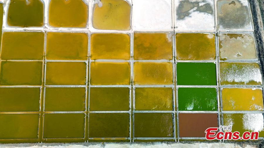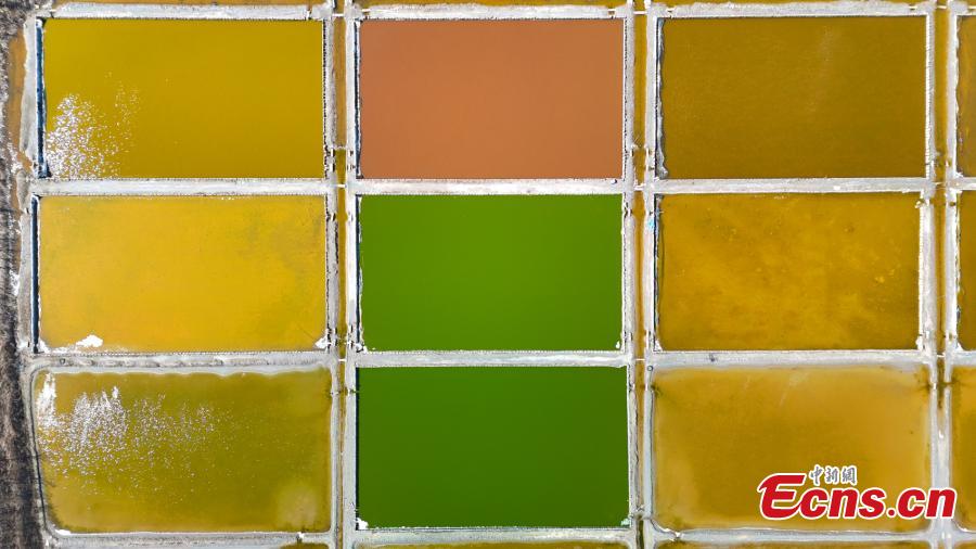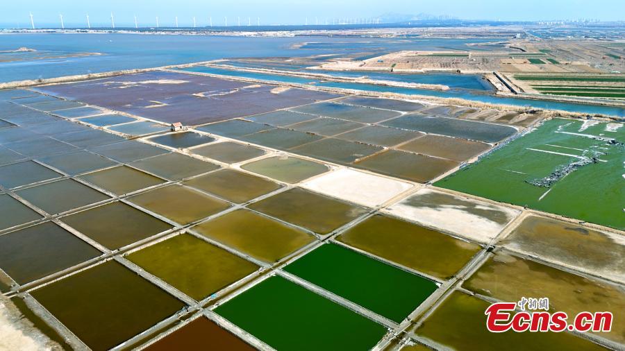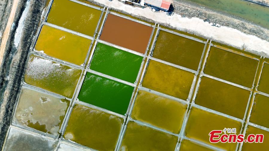 An aerial view of a colorful salt lake that resembles a giant palette in Rongcheng, east China's Shandong Province, March 19, 2024. (Photo/VCG)