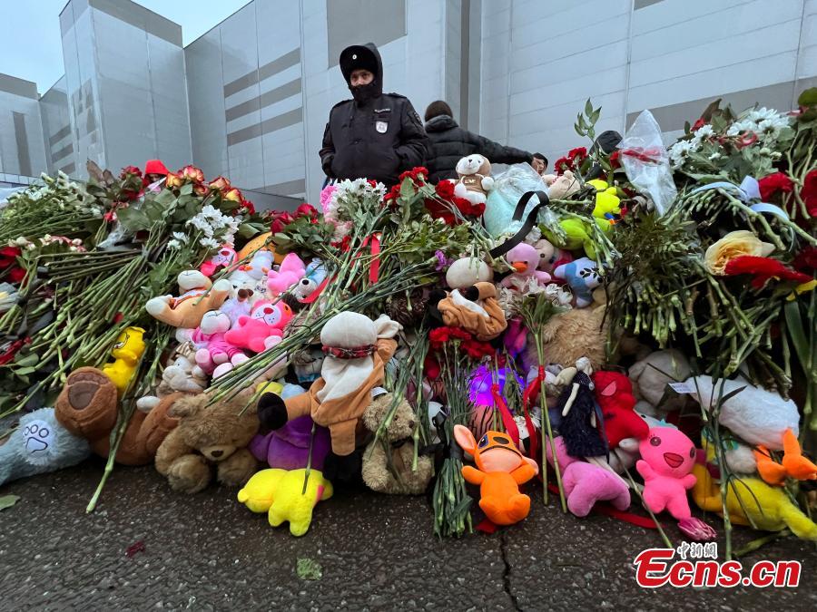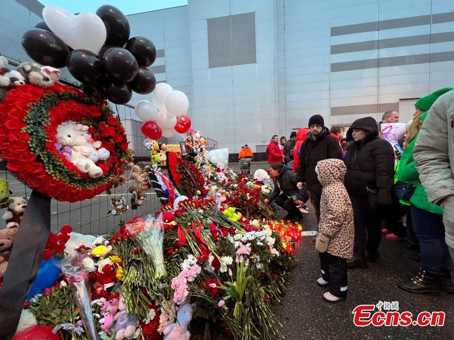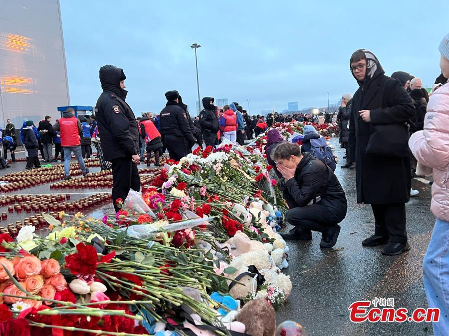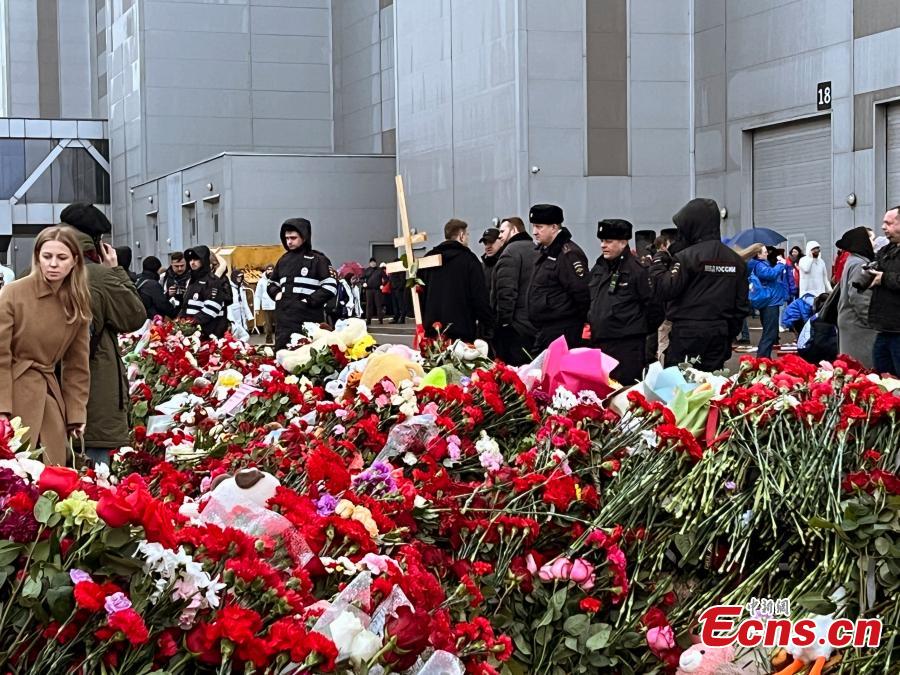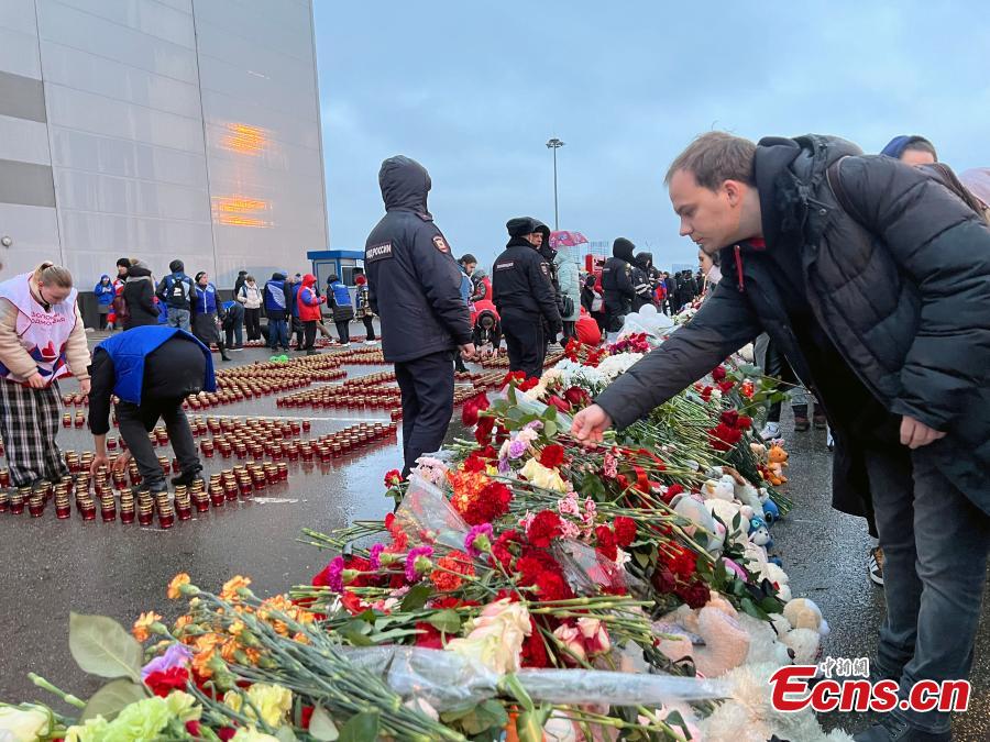 People lay flowers to mourn victims of a terrorist attack in Moscow, Russia, March 24, 2024. (Photo: China News Service/Tian Bing)
