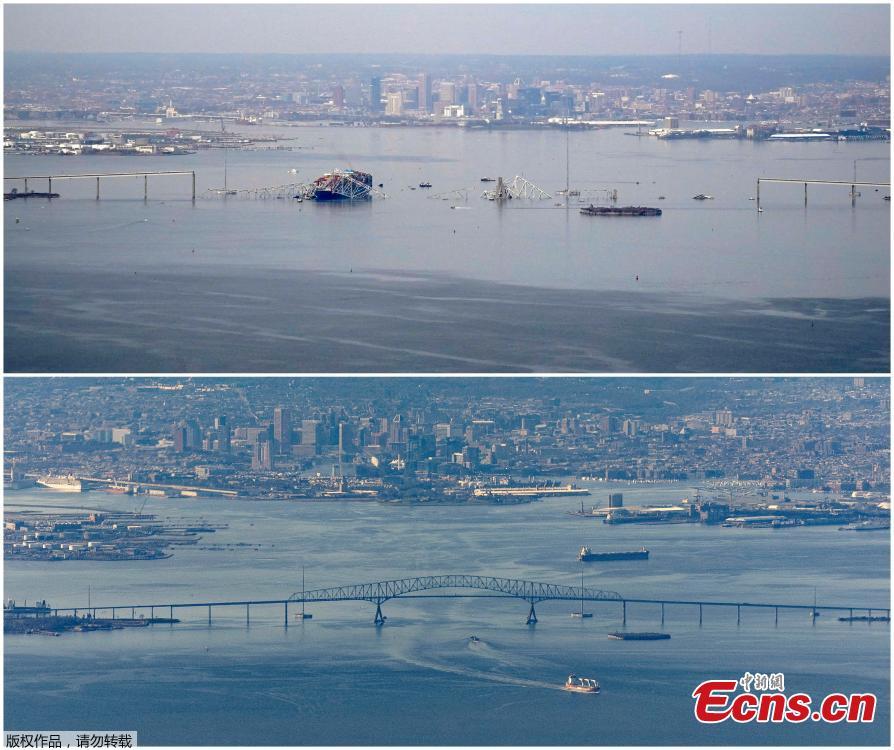 Combination picture shows the Dali cargo vessel which crashed into the Francis Scott Key Bridge causing it to collapse on March 26, 2024 (top) and a ship sailing under the Francis Scott Key Bridge, in Baltimore, Maryland, the United States, March 26, 2024. (Photo/Agencies)
