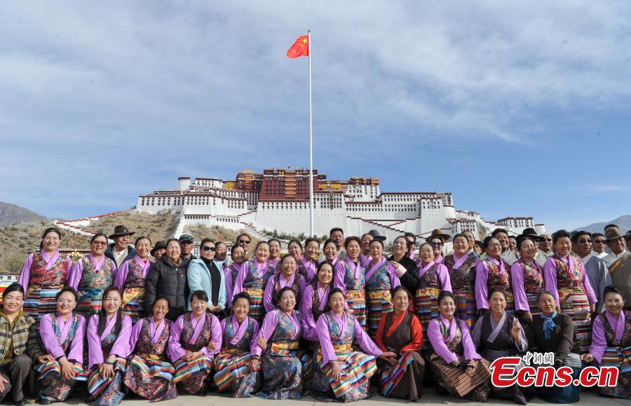 People pose for photos after a flag-raising ceremony to celebrate the Serfs' Emancipation Day at the square in front of the Potala Palace in Lhasa, southwest China's Xizang Autonomous Region, March 28, 2024. (Photo/China News Service)