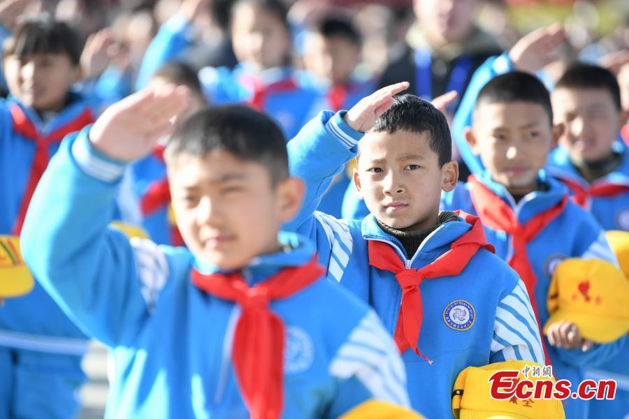 Young pioneers salute at a flag-raising ceremony to celebrate the Serfs' Emancipation Day at the square in front of the Potala Palace in Lhasa, southwest China's Xizang Autonomous Region, March 28, 2024. (Photo/China News Service)