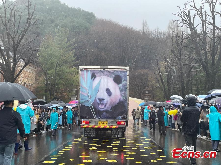 A specially-made vehicle carrying giant panda Fu Bao passes through panda lovers who braved the rainy weather to say goodbye to the first giant panda born in South Korea, April 3, 2024. (Photo: China News Service/Liu Xu)