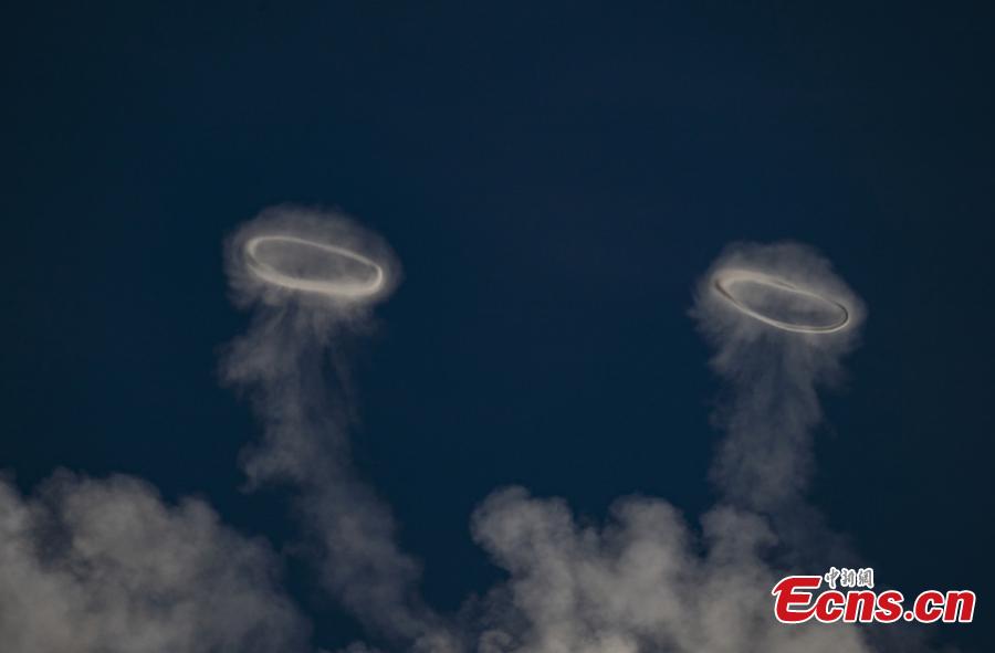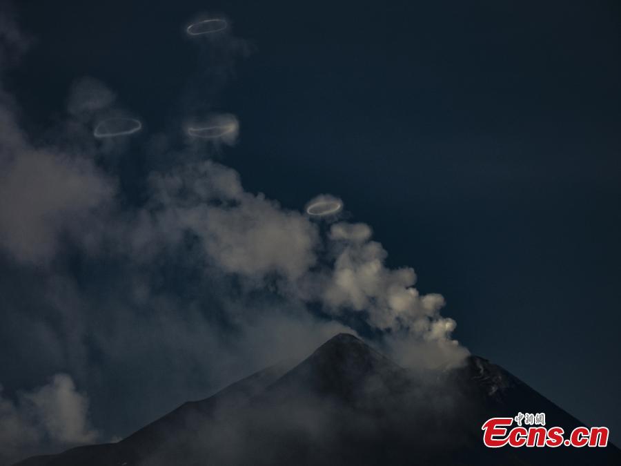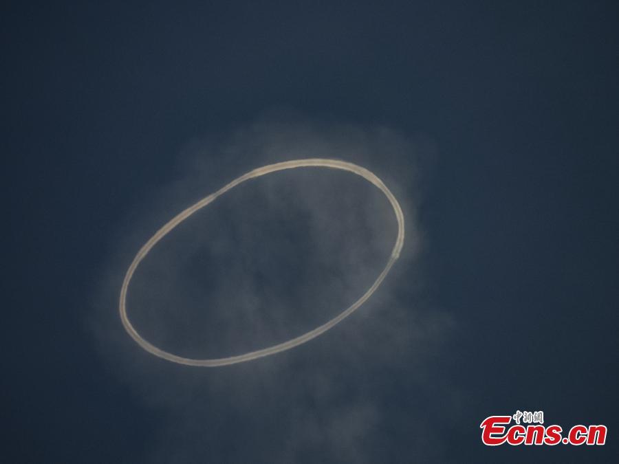 Steam ring against the sky, after being blown from the Bocca Nuova vent of Mount Etna, a volcano on the island of Sicily, Italy, April 6, 2024. (Photo/VCG)