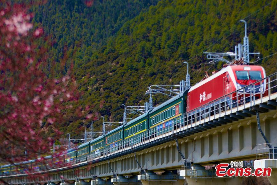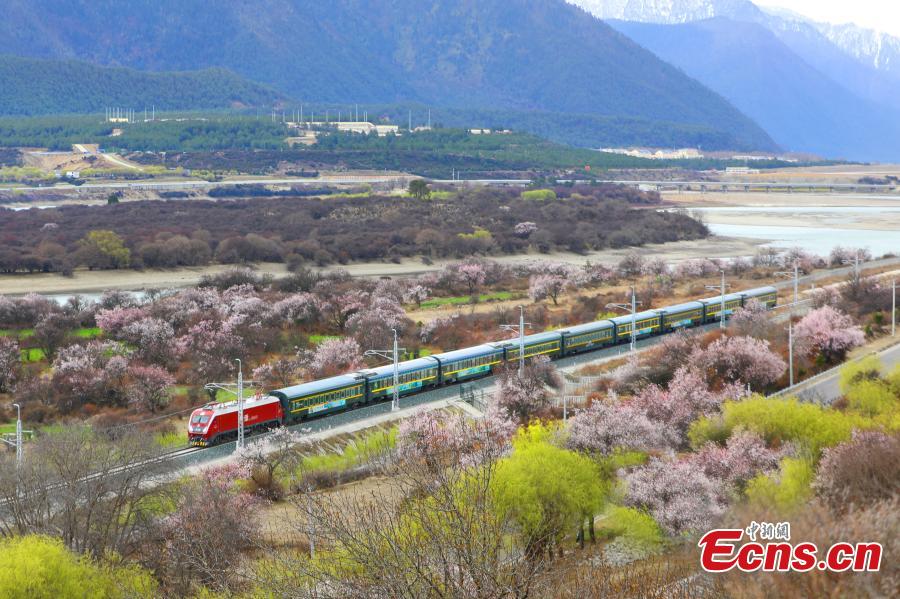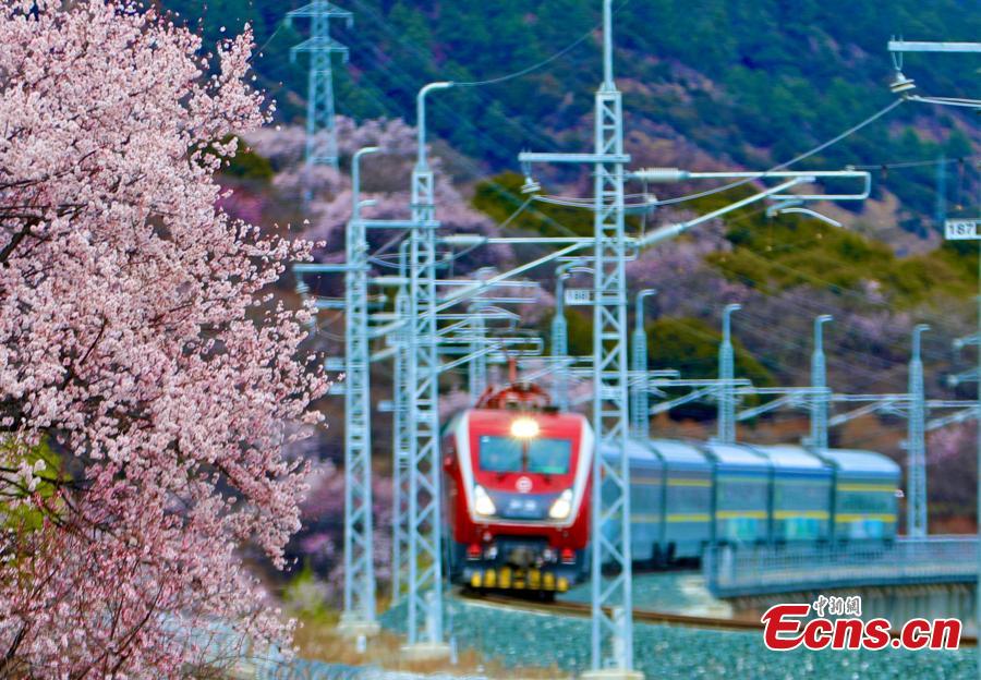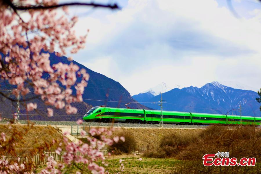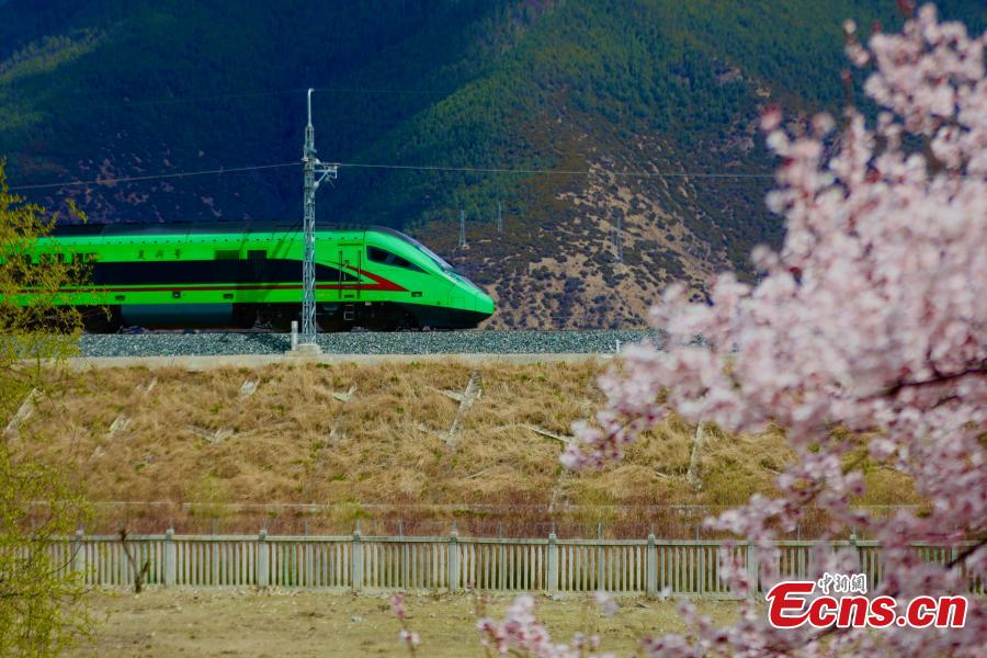 A Fuxing bullet train runs through peach blossoms on the Lhasa-Nyingchi railway in southwest China's Xizang autonomous Region in April 7, 2024. (Photo: China News Service/Ma Shengming)