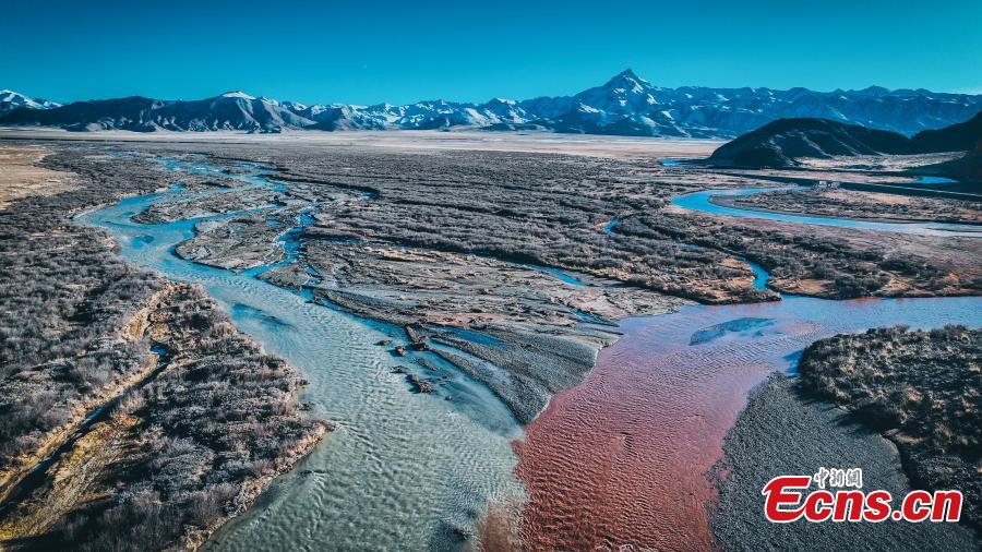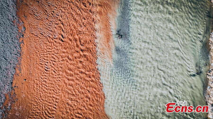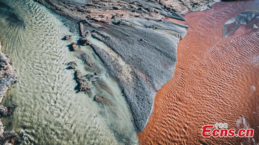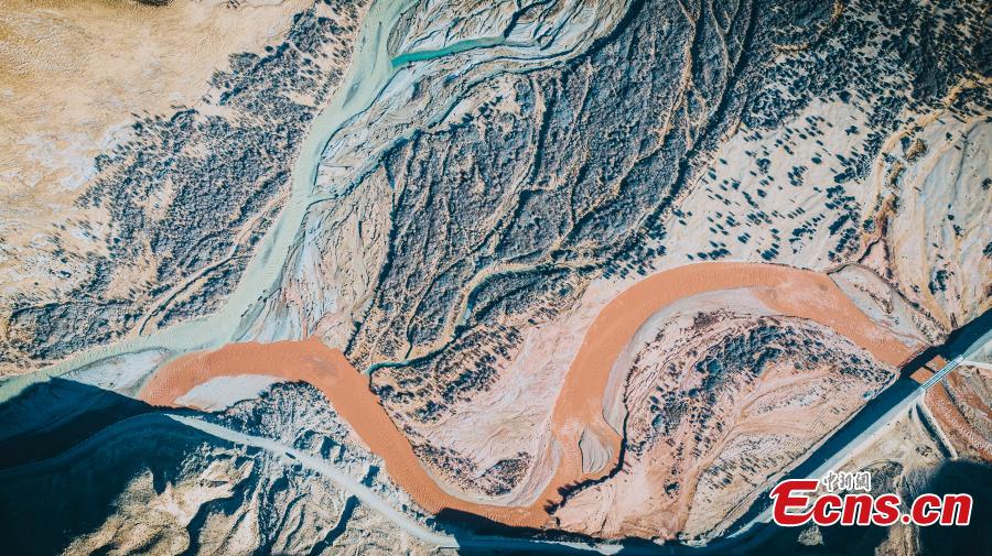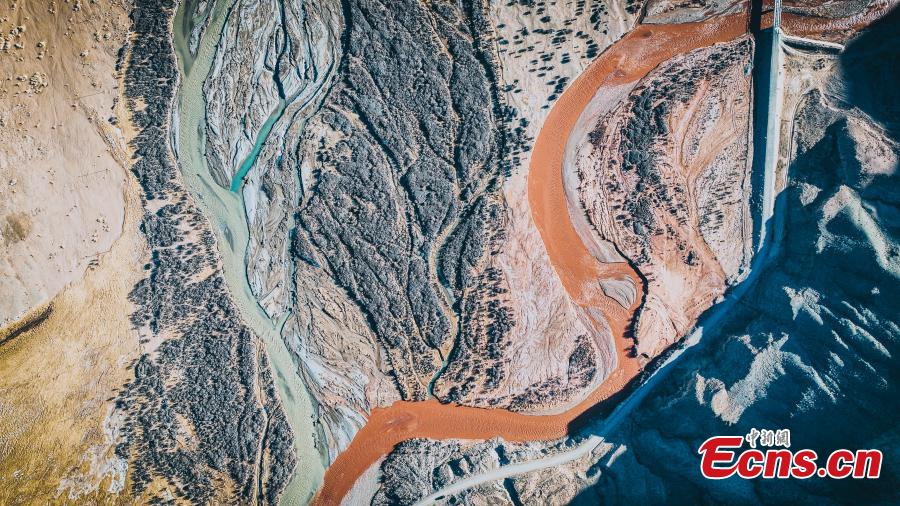 The confluence of two rivers reveals a stunning scene as the two sources reflect totally different colors in Dulan County, northwest Qinghai Province, April 7, 2024. (Photo provided to China News Service)