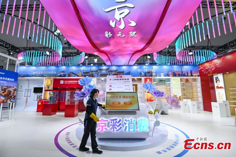 A staff member cleans a booth for the 4th China International Consumer Products Expo in Haikou, south China's Hainan Province, April 10, 2024. (Photo: China News Service/Luo Yunfei)