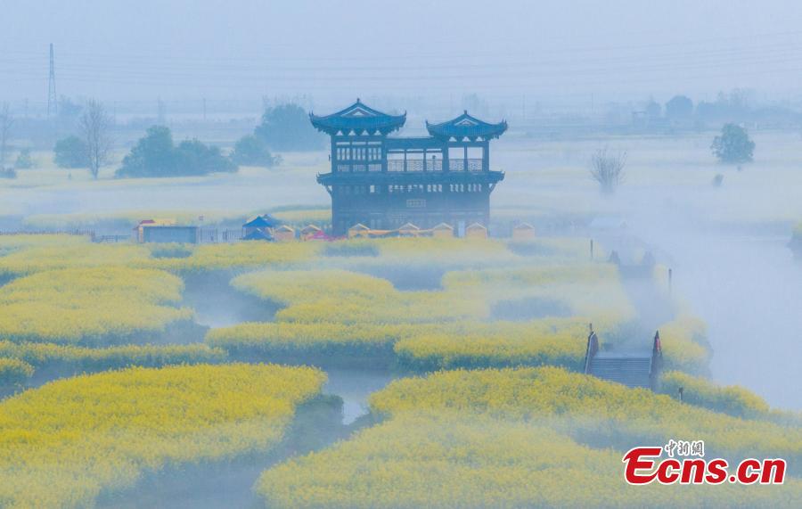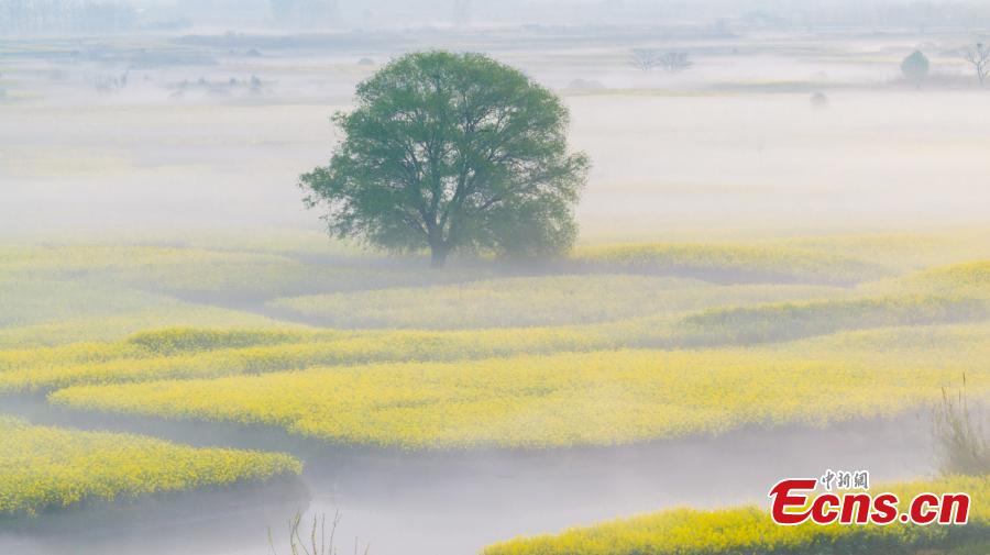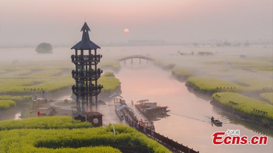 Aerial view of beautiful sunrise scenery of mist-shrouded sea of cole flowers in Xinghua, east China's Jiangsu Province, April 9, 2024. (Photo/VCG)