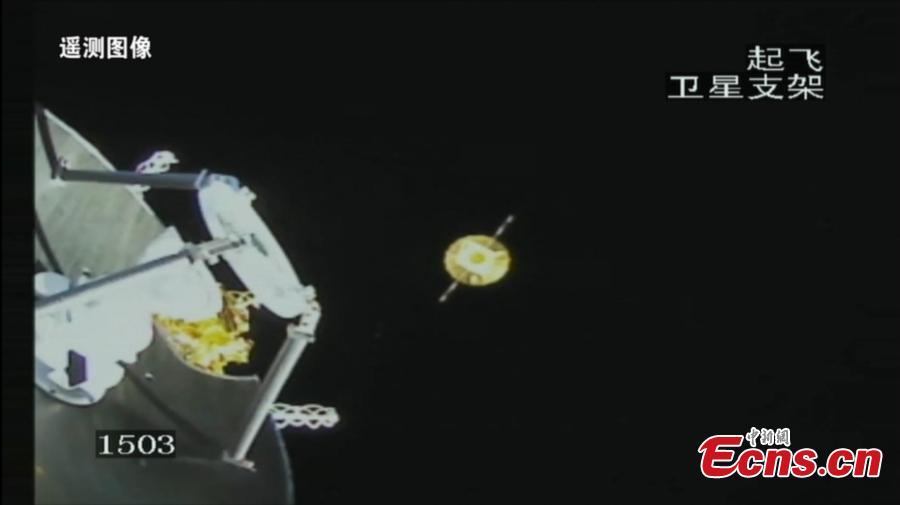Photo shows China's Queqiao 2, or Magpie Bridge 2, a relay satellite for China's lunar mission, is released from a Long March 8 carrier rocket and its solar wings and communication antennas smoothly unfolded. (Photo provided to China News Service)