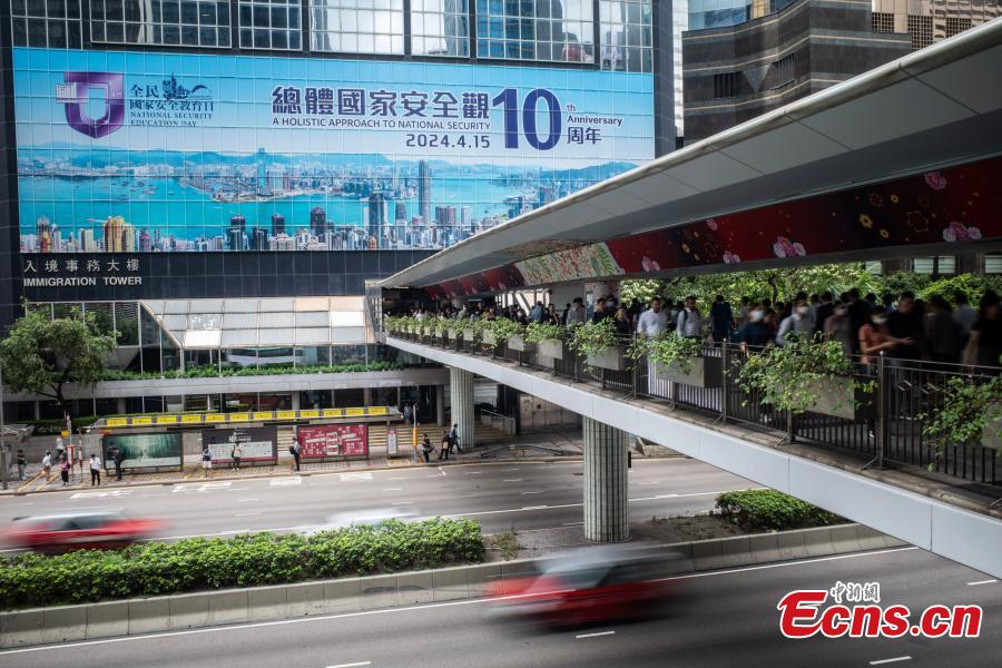 A poster is hung to mark the fourth National Security Education Day in the Hong Kong Special Administrative Region, April 15, 2024. (Photo: China News Service/Hou Yu)
