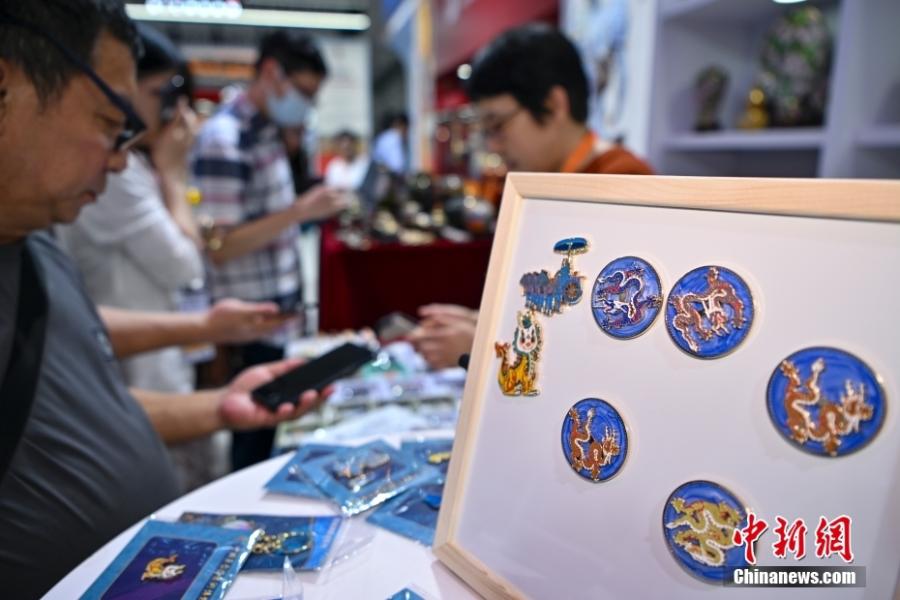 Fridge magnets of jingtailan, or cloisonné enamel, are showcased during the ongoing China International Consumer Products Expo 2024 in Haikou, south China's Hainan Province, April 16, 2024. (Photo: China News Service/Luo Yunfei)