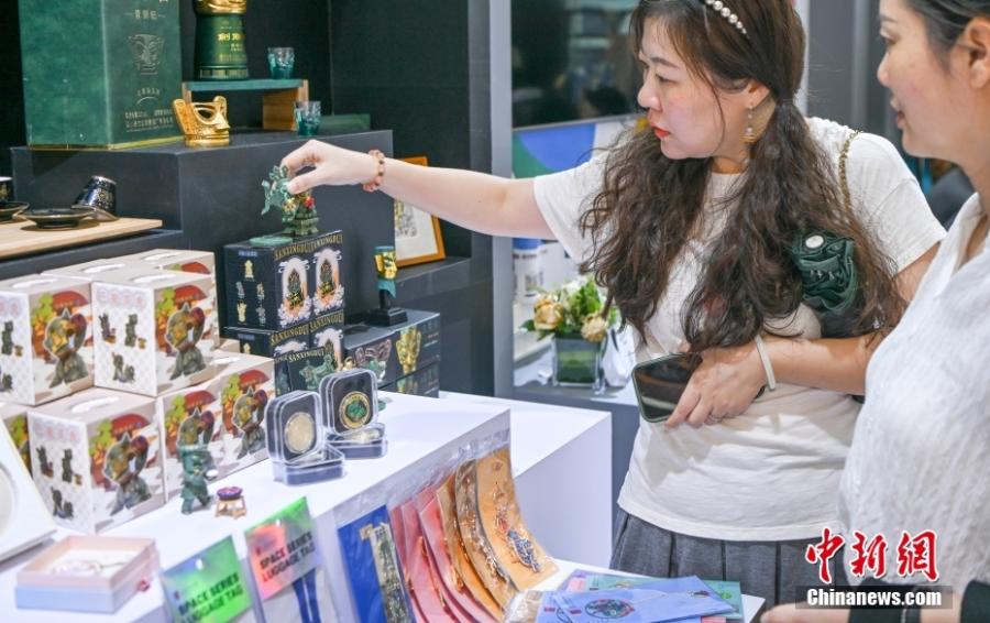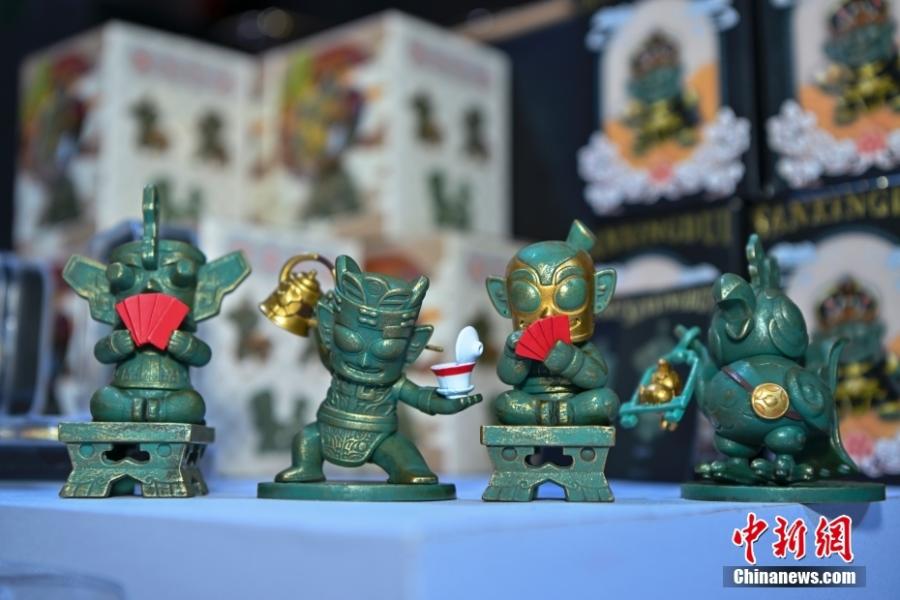 Creative products themed with archaeological discoveries from Sanxingdui Ruins site are showcased during the ongoing China International Consumer Products Expo 2024 in Haikou, south China's Hainan Province, April 16, 2024. (Photo: China News Service/Luo Yunfei)