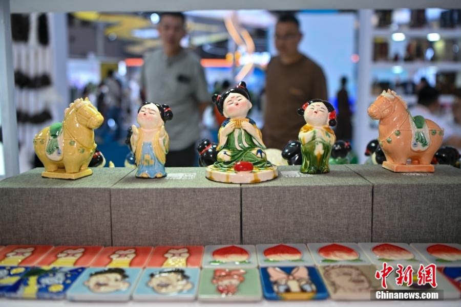 Tri-colored glazed potteries, or Tangsancai of the Tang Dynasty (618-907), are exhibited during the ongoing China International Consumer Products Expo 2024 in Haikou, south China's Hainan Province, April 16, 2024. (Photo: China News Service/Luo Yunfei)