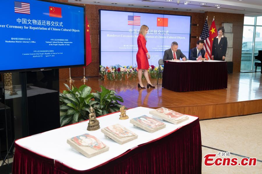 Officials from China and the U.S. attend a handover ceremony of returned Chinese cultural objects at the Chinese Consulate General in New York, the United States, April 17, 2024. (Photo: China News Service/Liao Pan)