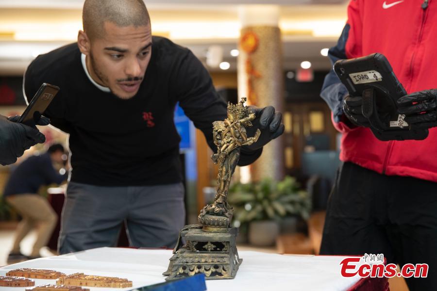 A staff member checks a returned Chinese cultural object at a handover ceremony at the Chinese Consulate General in New York, the United States, on April 17, 2024. (Photo: China News Service/Liao Pan)