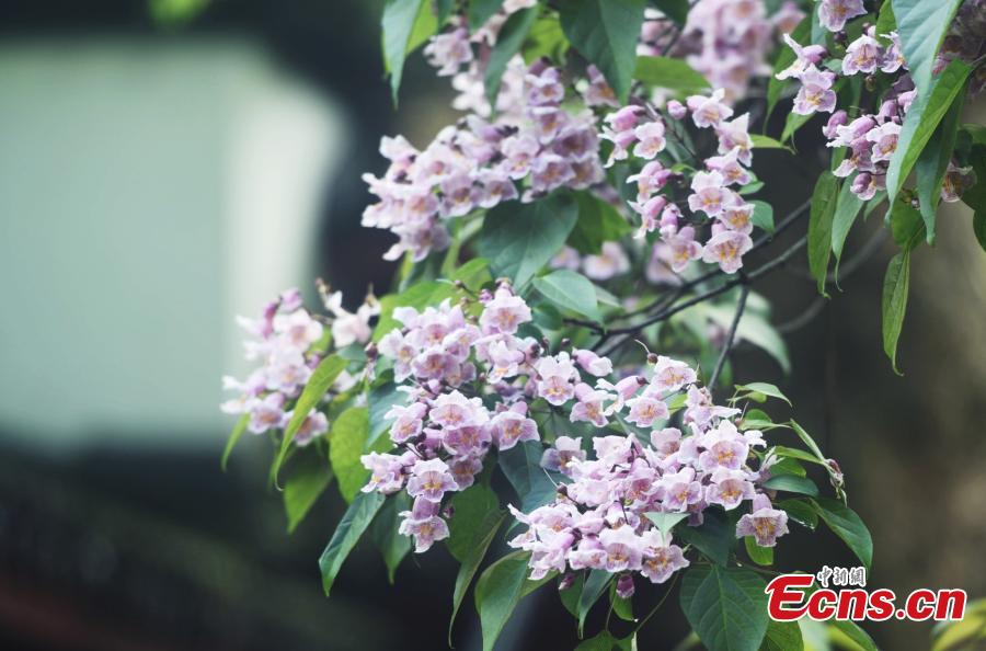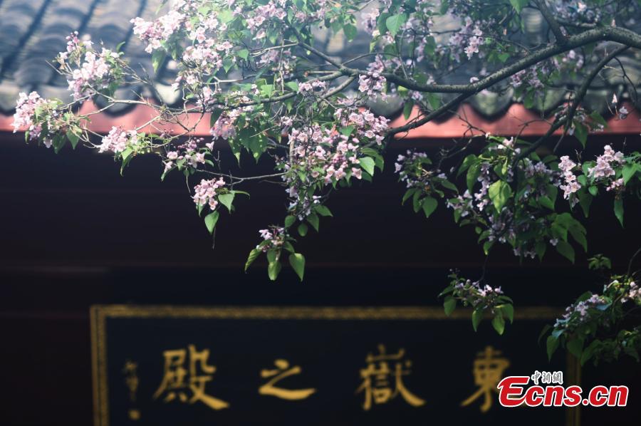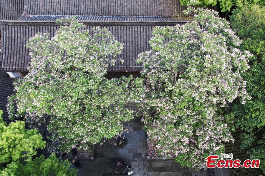 Two ancient catalpa bungei trees aged 530 years are in full bloom at Dongyue Temple in Hangzhou, east China's Zhejiang Province, April 18, 2024. (Photo/VCG)
