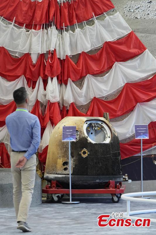 Photo shows the return capsule of China’s “Chang'e 5” lunar mission, along with the main parachute used for landing on an exhibition to celebrate the Space Day of China in Wuhan, Central China’s Hubei Province, April 23, 2024. (Photo: China News Service/Cui Nan)