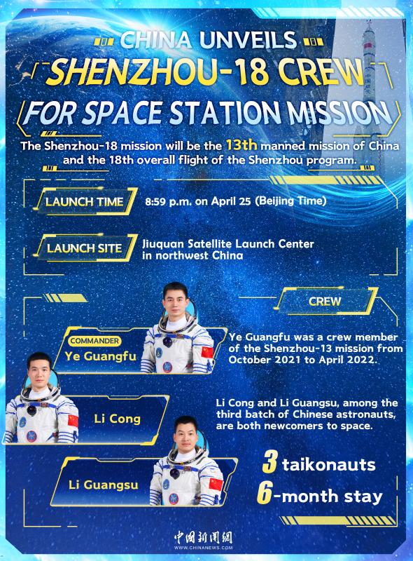 Chinese astronauts Ye Guangfu, Li Cong and Li Guangsu will carry out the Shenzhou-18 crewed spaceflight mission, and Ye will be the commander, the China Manned Space Agency announced at a press conference on Wednesday.