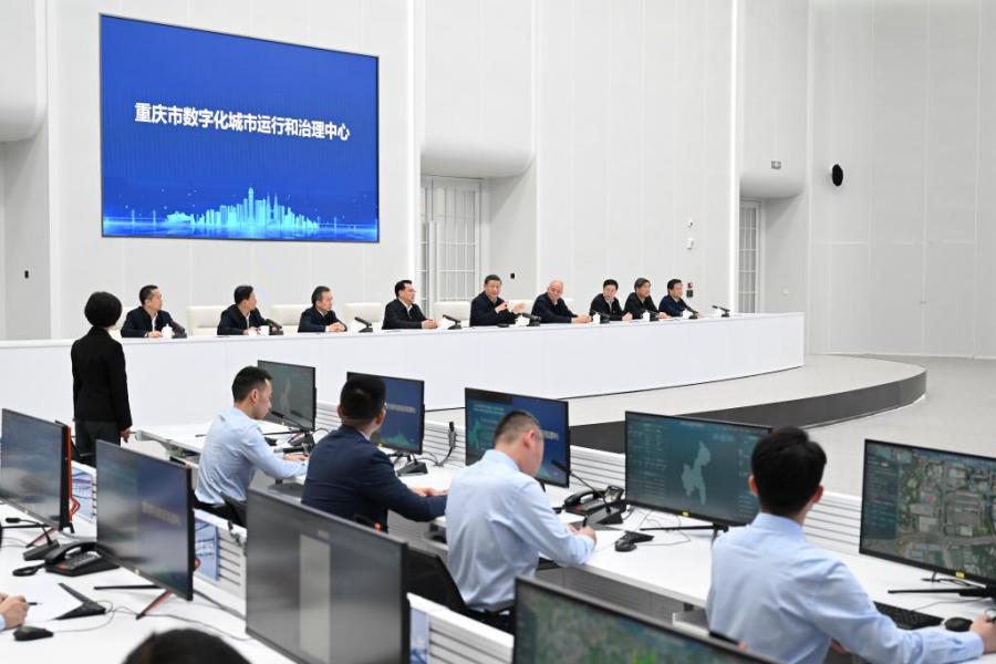 Chinese President Xi Jinping, also general secretary of the Communist Party of China Central Committee and chairman of the Central Military Commission, learns about the municipality's efforts in enhancing the modernization of city governance while visiting a digital urban operation and governance center in southwest China's Chongqing Municipality, April 23, 2024. Xi inspected southwest China's Chongqing Municipality from Monday to Tuesday. (Xinhua/Xie Huanchi)