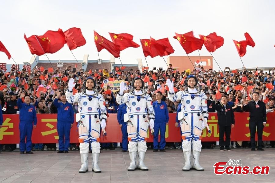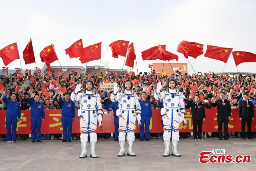 Chinese taikonauts Ye Guangfu (R), Li Cong (C) and Li Guangsu attend a see-off ceremony at the Jiuquan Satellite Launch Center in northwest China, April 25, 2024. (Photo: China News Service/Wang Jiangbo)