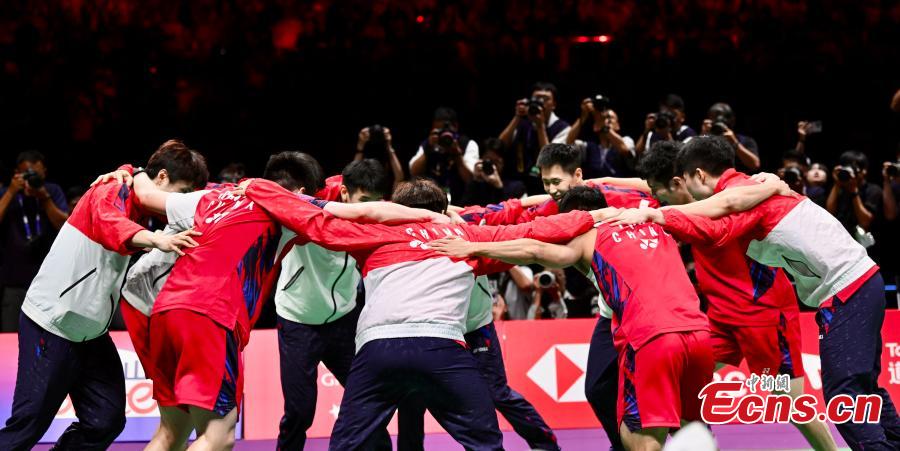 Players of China celebrate after winning the final match against Indonesia at the BWF Thomas Cup Finals in Chengdu, southwest China's Sichuan Province, May 5, 2024. (Photo/ICphoto)