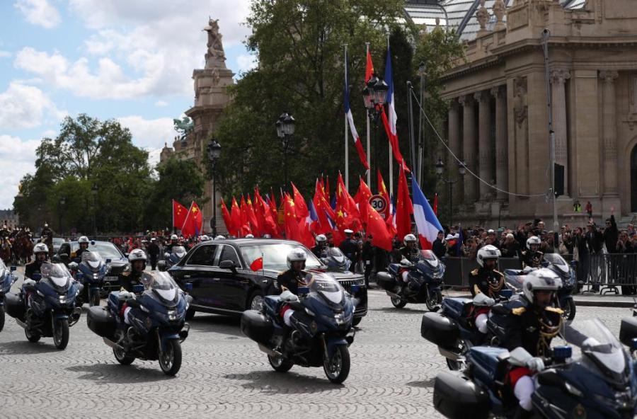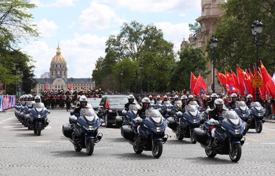 The motorcade of Chinese President Xi Jinping and his wife Peng Liyuan is escorted by mounted guards and motorcycles to Elysee Palace after a welcome ceremony in Paris, France, May 6, 2024. Xi on Monday attended a welcome ceremony held by French President Emmanuel Macron. (Xinhua/Gao Jing)