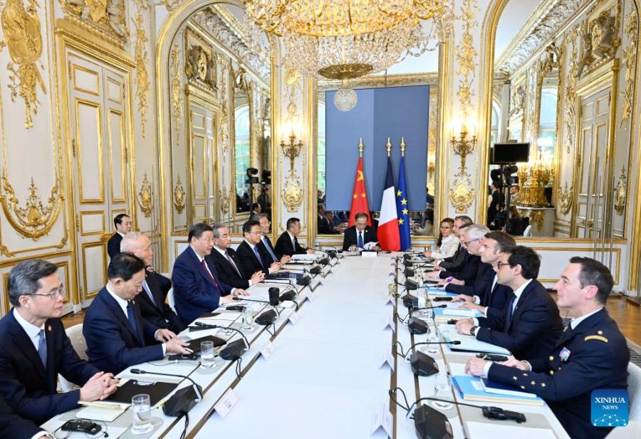 Chinese President Xi Jinping and his French counterpart, Emmanuel Macron, hold talks at Elysee Palace, in Paris, France, May 6, 2024. (Xinhua/Yin Bogu)
