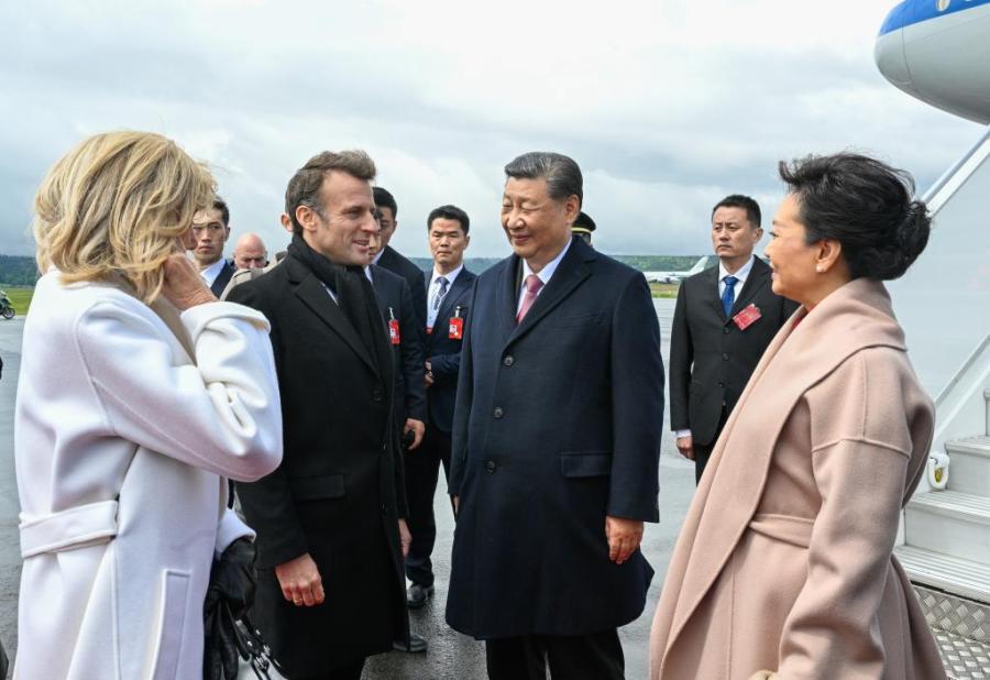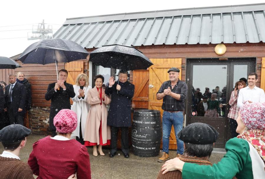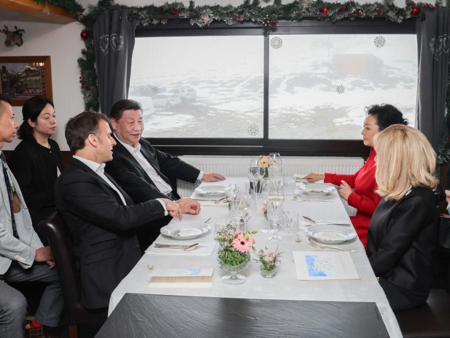 Amid falling snows in the picturesque mountains in Hautes-Pyrenees Department in southwestern France, Chinese President Xi Jinping and his wife Peng Liyuan were warmly received by French President Emmanuel Macron and his wife Brigitte Macron on Tuesday at a mountain restaurant for a restricted meeting.