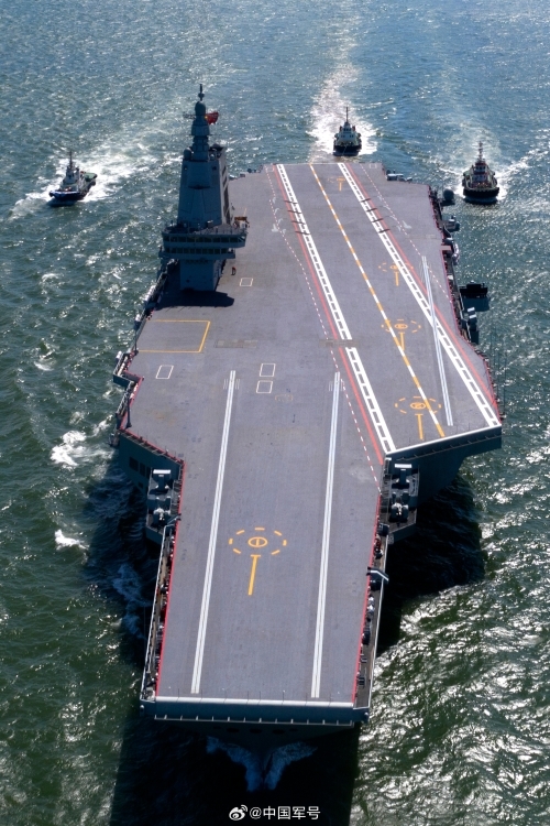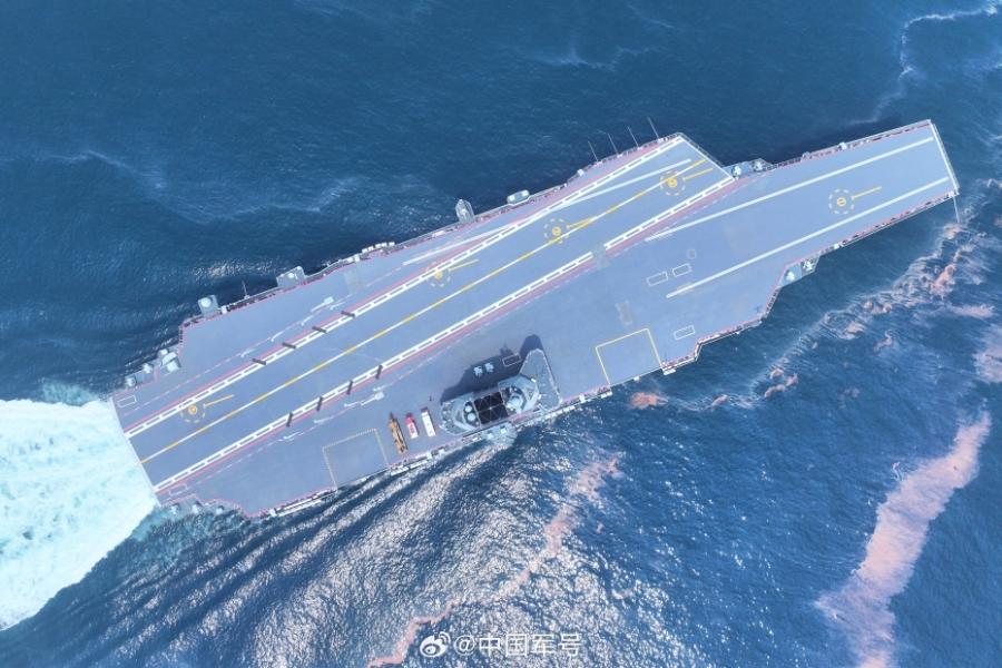 Aerial view shows China's third aircraft carrier, the Fujian, during its maiden sea trials. (Photo/Official Weibo account of Chinese People's Liberation Army)