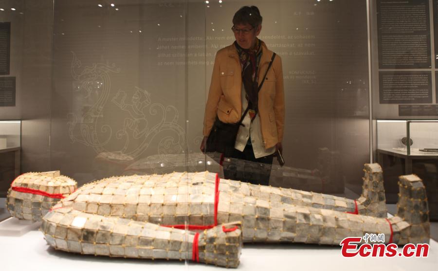 A visitor views jade clothes sewn with gold wire dating back to the Western Han Dynasty (202 B.C. - 9 A.D.) at an exhibition in Hungary, May 7, 2024. (Photo: China News Service/De Yongjian)